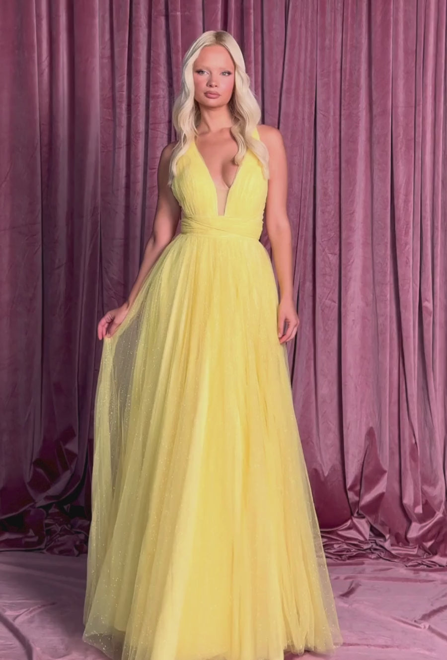 This glamorous evening gown is crafted out of a luxe lurex fabric and features a halter neckline with an incredible plunging front with illusion mesh panel and a gathered bodice and waistband. The gown also features an open back with multi way back and waist ties allowing the gown to be worn in multiple ways.