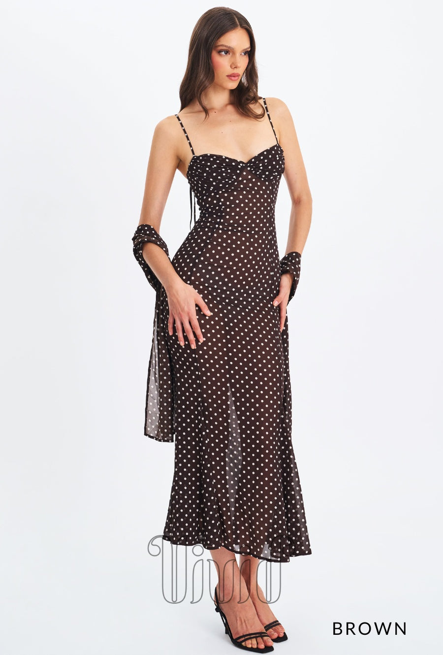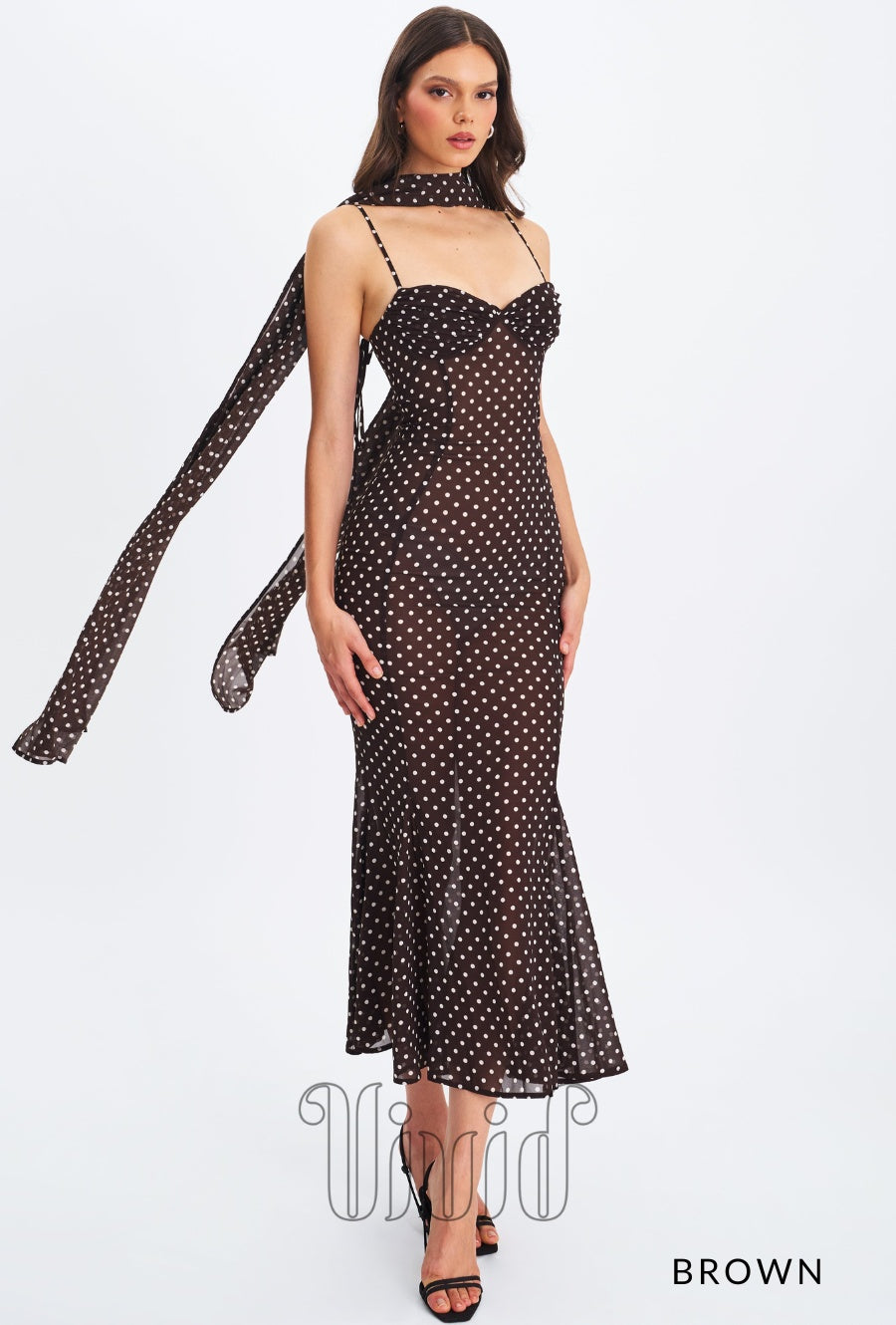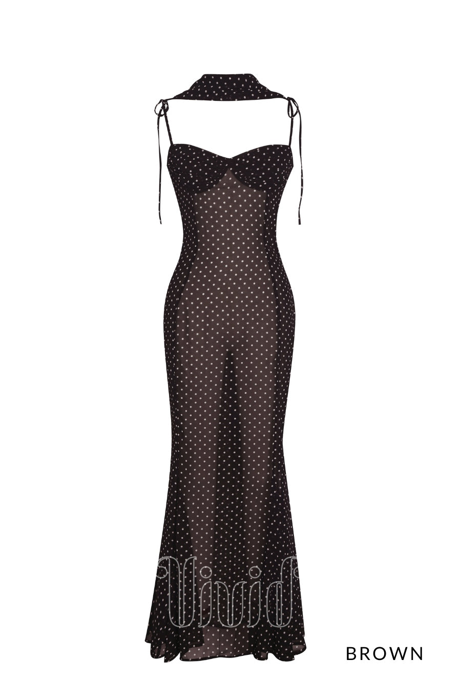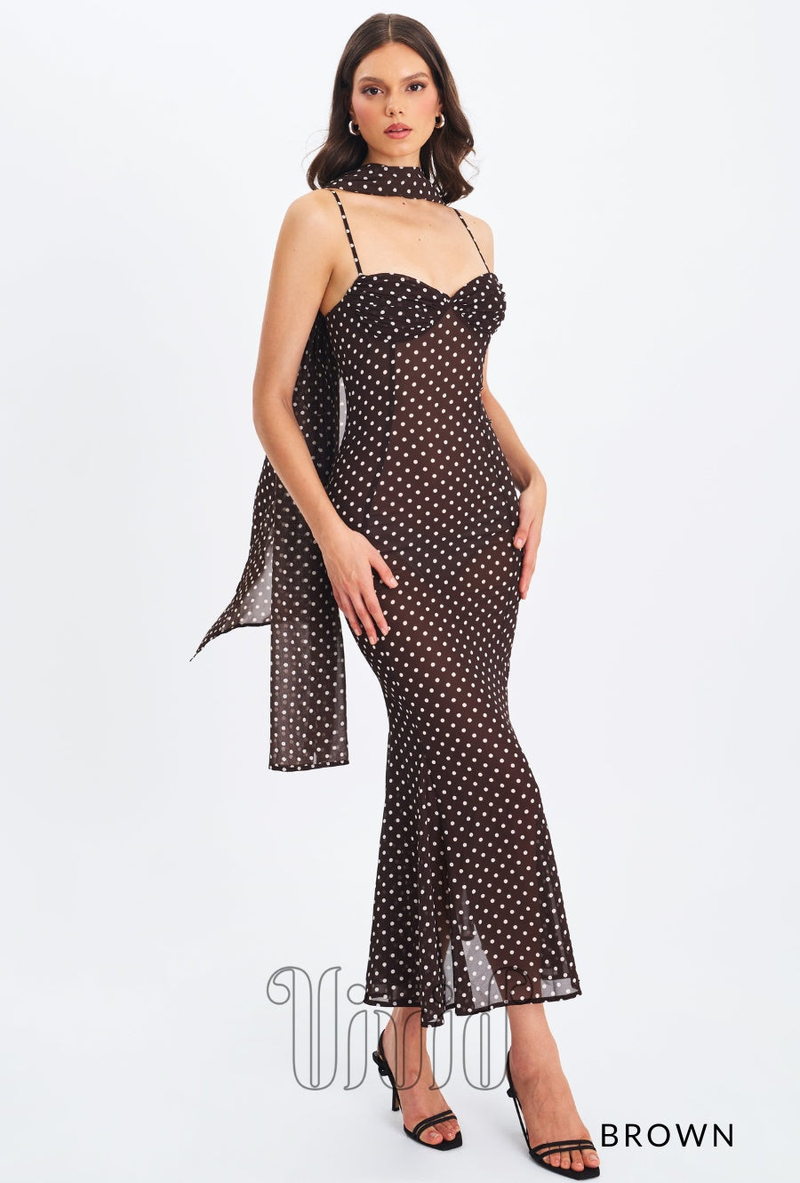 Elegance meets charm in the Evie Dress — a flowing maxi silhouette crafted in sheer chiffon with a polka dot print. Designed with adjustable straps and a flattering ruched bust, this mermaid-style dress features an invisible zipper for a seamless finish. Fully lined for comfort, it also comes with a matching chiffon scarf, making it the perfect look for romantic evenings, destination weddings, or sunset dinners.