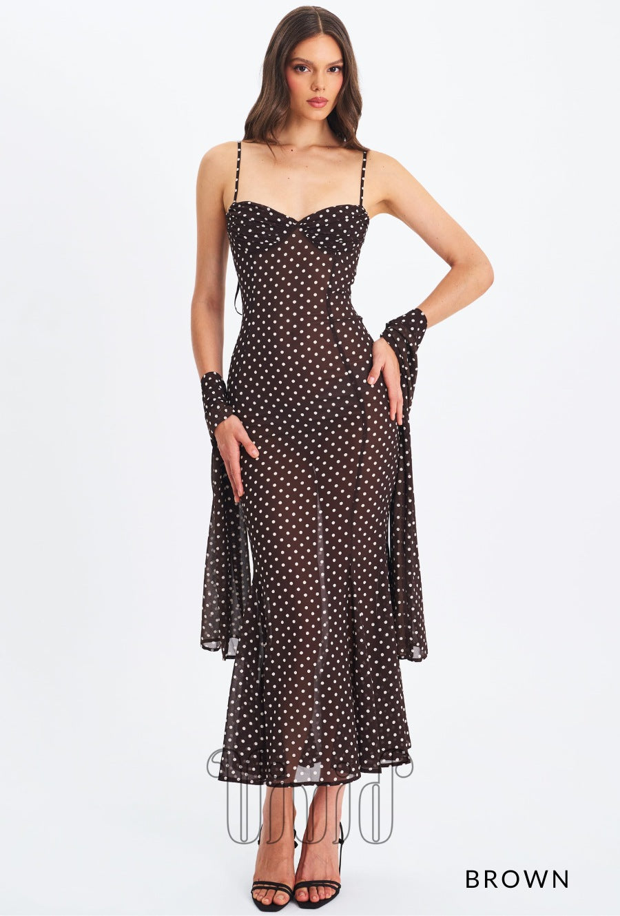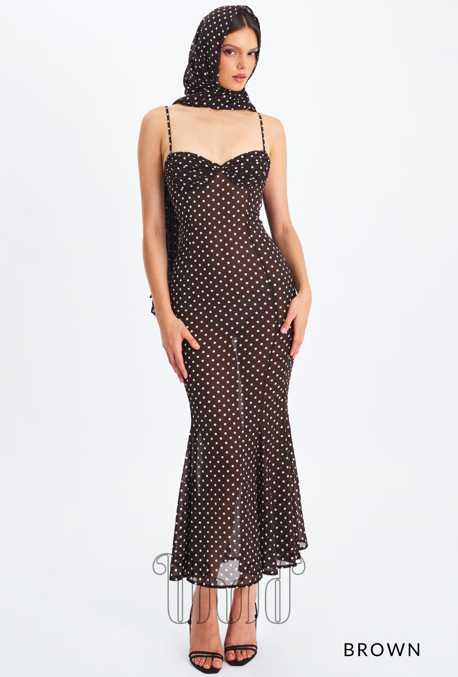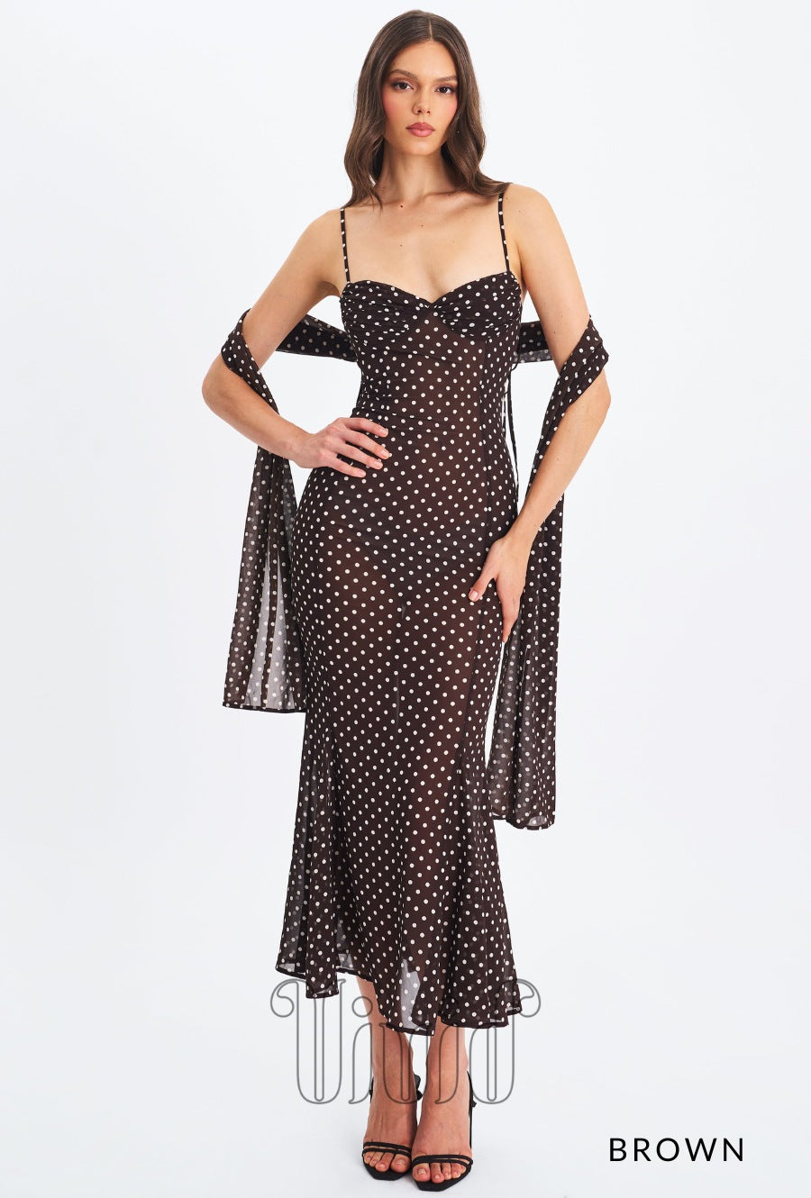 Elegance meets charm in the Evie Dress — a flowing maxi silhouette crafted in sheer chiffon with a polka dot print. Designed with adjustable straps and a flattering ruched bust, this mermaid-style dress features an invisible zipper for a seamless finish. Fully lined for comfort, it also comes with a matching chiffon scarf, making it the perfect look for romantic evenings, destination weddings, or sunset dinners.