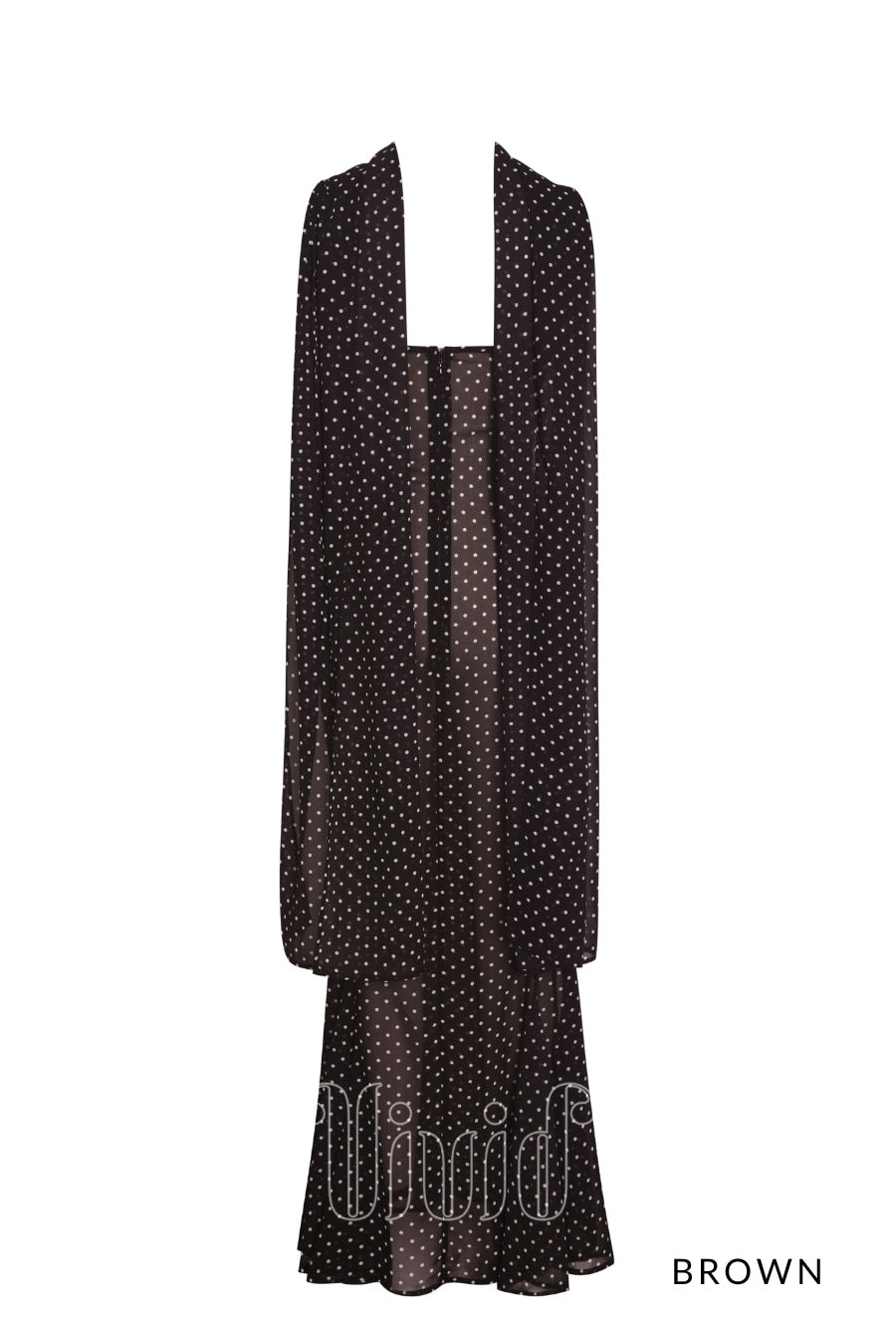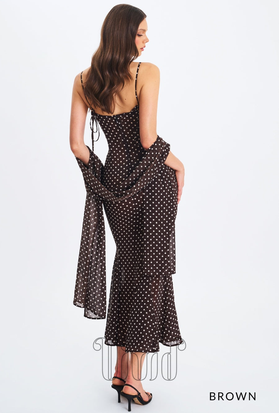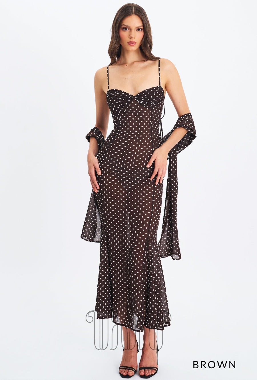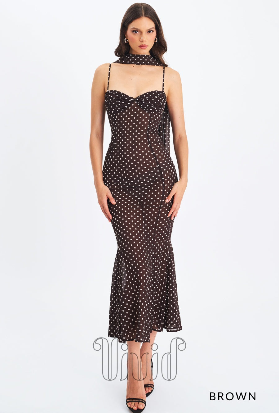 Elegance meets charm in the Evie Dress — a flowing maxi silhouette crafted in sheer chiffon with a polka dot print. Designed with adjustable straps and a flattering ruched bust, this mermaid-style dress features an invisible zipper for a seamless finish. Fully lined for comfort, it also comes with a matching chiffon scarf, making it the perfect look for romantic evenings, destination weddings, or sunset dinners.