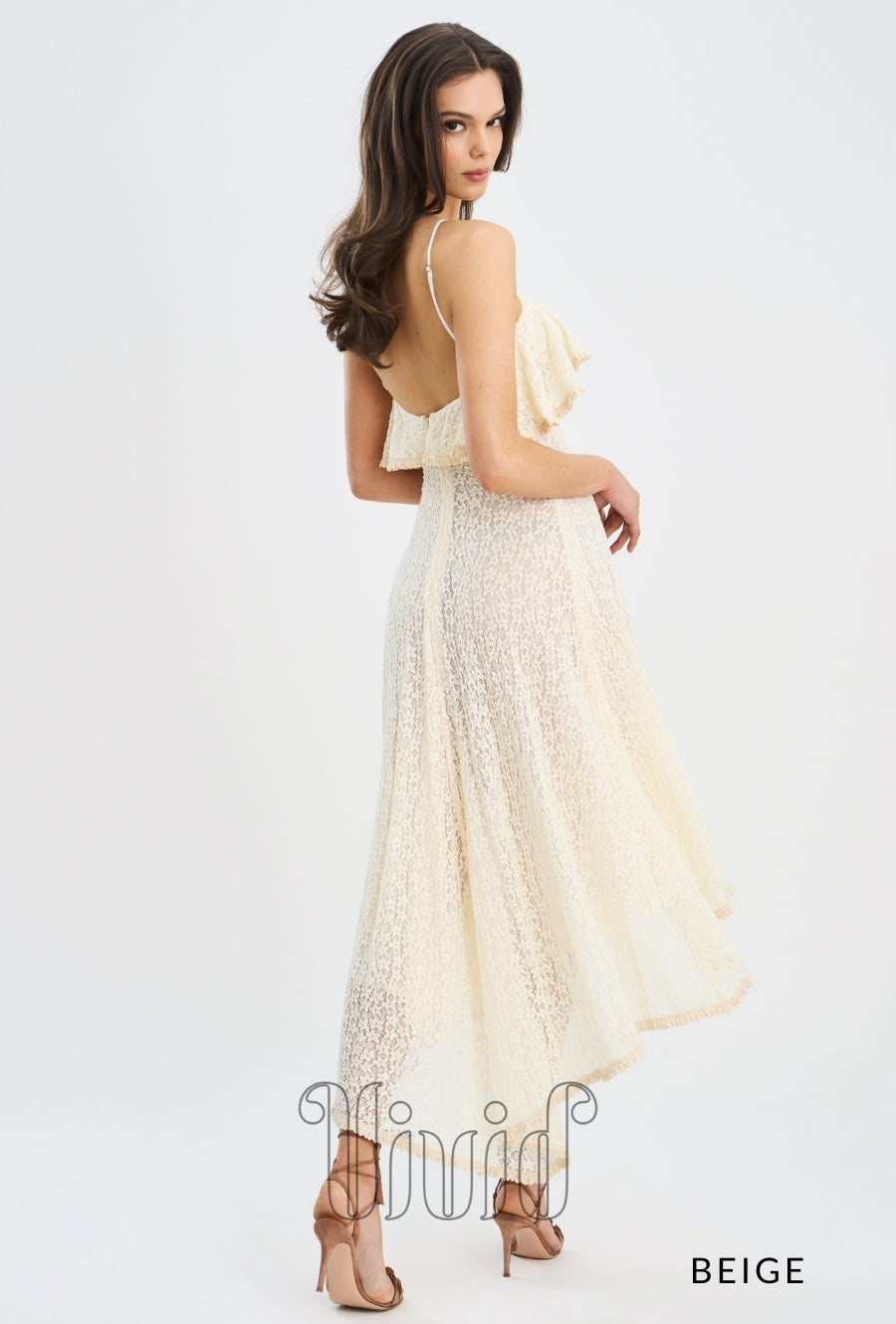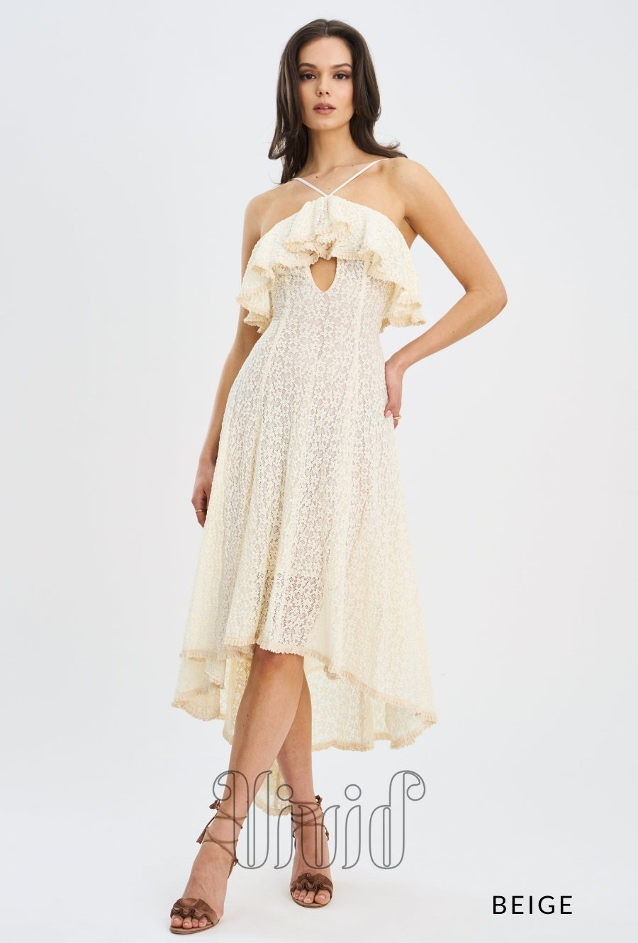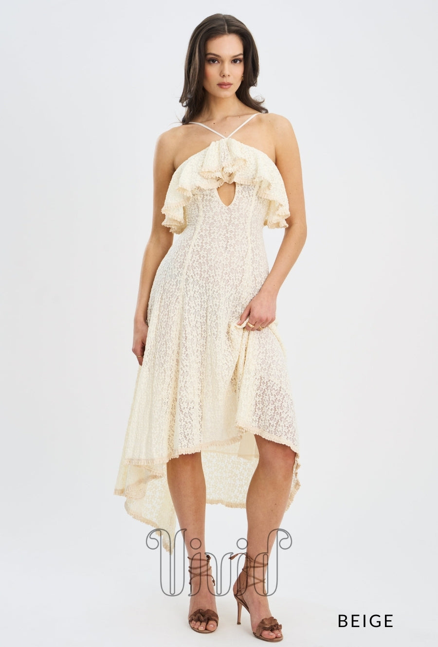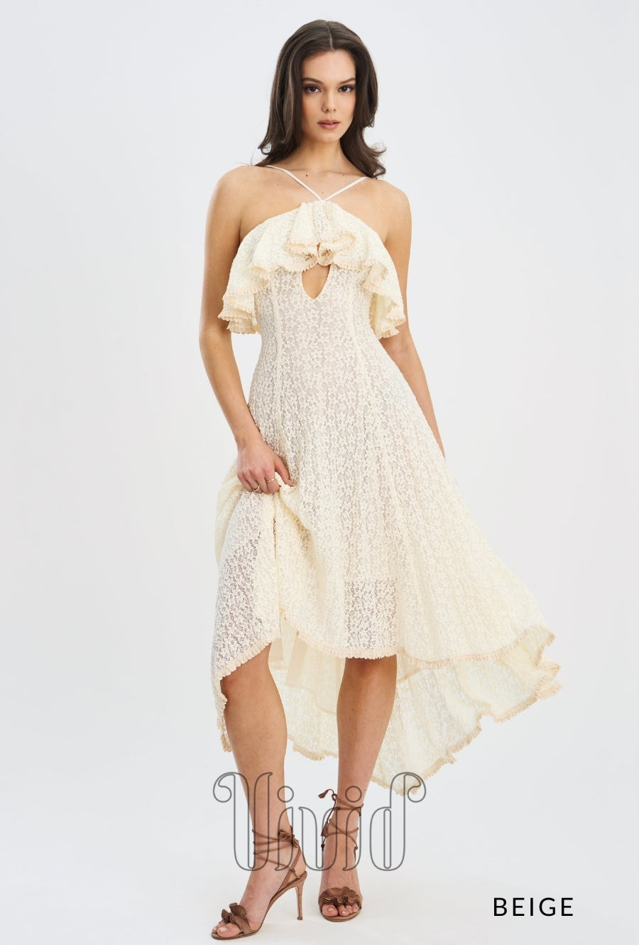 Ethereal and effortlessly romantic, the Florence Dress brings delicate details to life in a graceful midi high/low silhouette. Designed in a soft beige floral crochet fabric, this sleeveless dress features a ruffled bust decoration, lace trim, and a subtle keyhole cutout for a touch of charm. The adjustable straps and stretchable fit ensure comfort, while the trailing hem adds movement and elegance. Finished with an invisible zipper and an alluring backless design, the Florence is perfect for warm-weather soirées, vacation evenings, or any moment you want to feel beautifully undone.