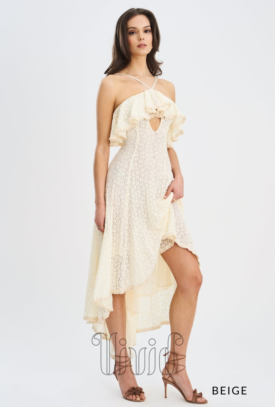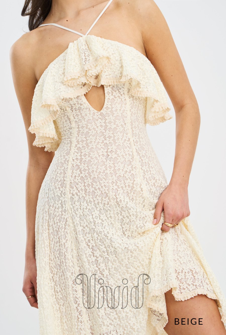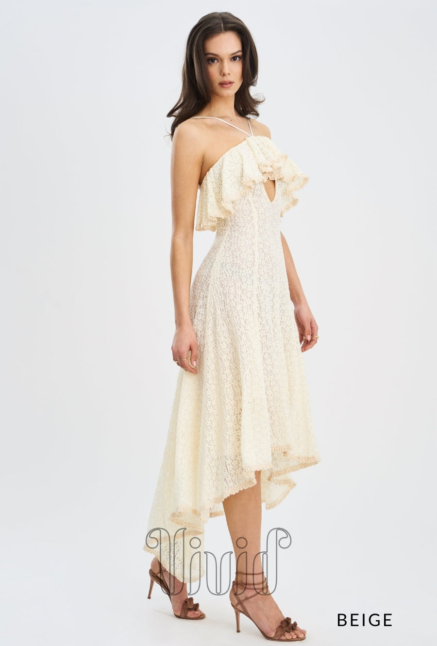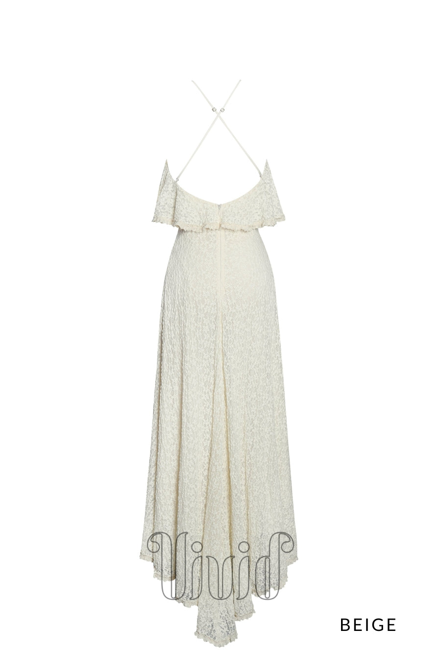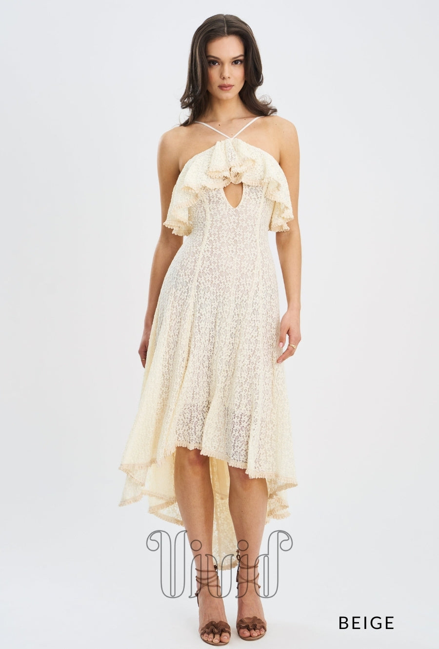 Ethereal and effortlessly romantic, the Florence Dress brings delicate details to life in a graceful midi high/low silhouette. Designed in a soft beige floral crochet fabric, this sleeveless dress features a ruffled bust decoration, lace trim, and a subtle keyhole cutout for a touch of charm. The adjustable straps and stretchable fit ensure comfort, while the trailing hem adds movement and elegance. Finished with an invisible zipper and an alluring backless design, the Florence is perfect for warm-weather soirées, vacation evenings, or any moment you want to feel beautifully undone.