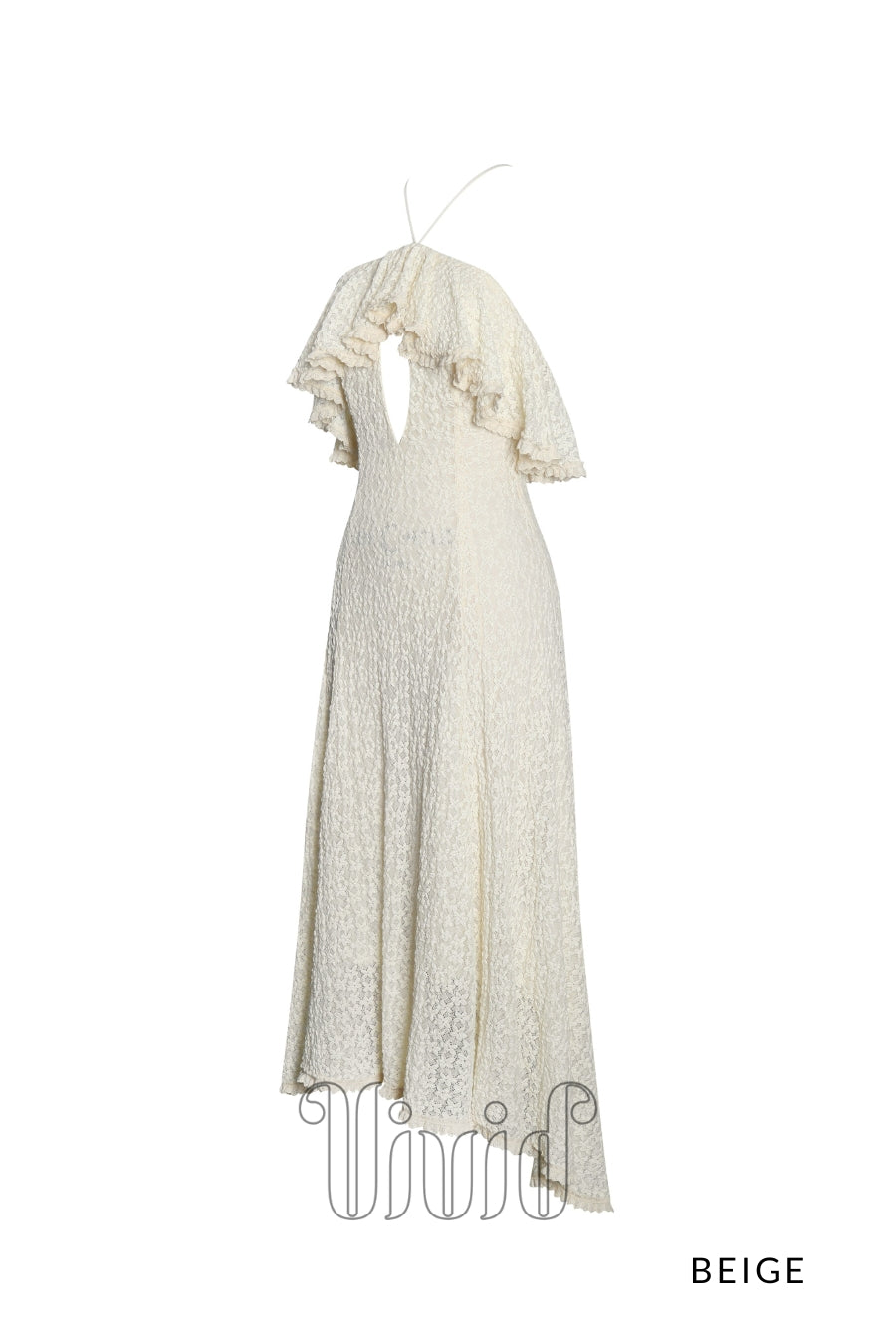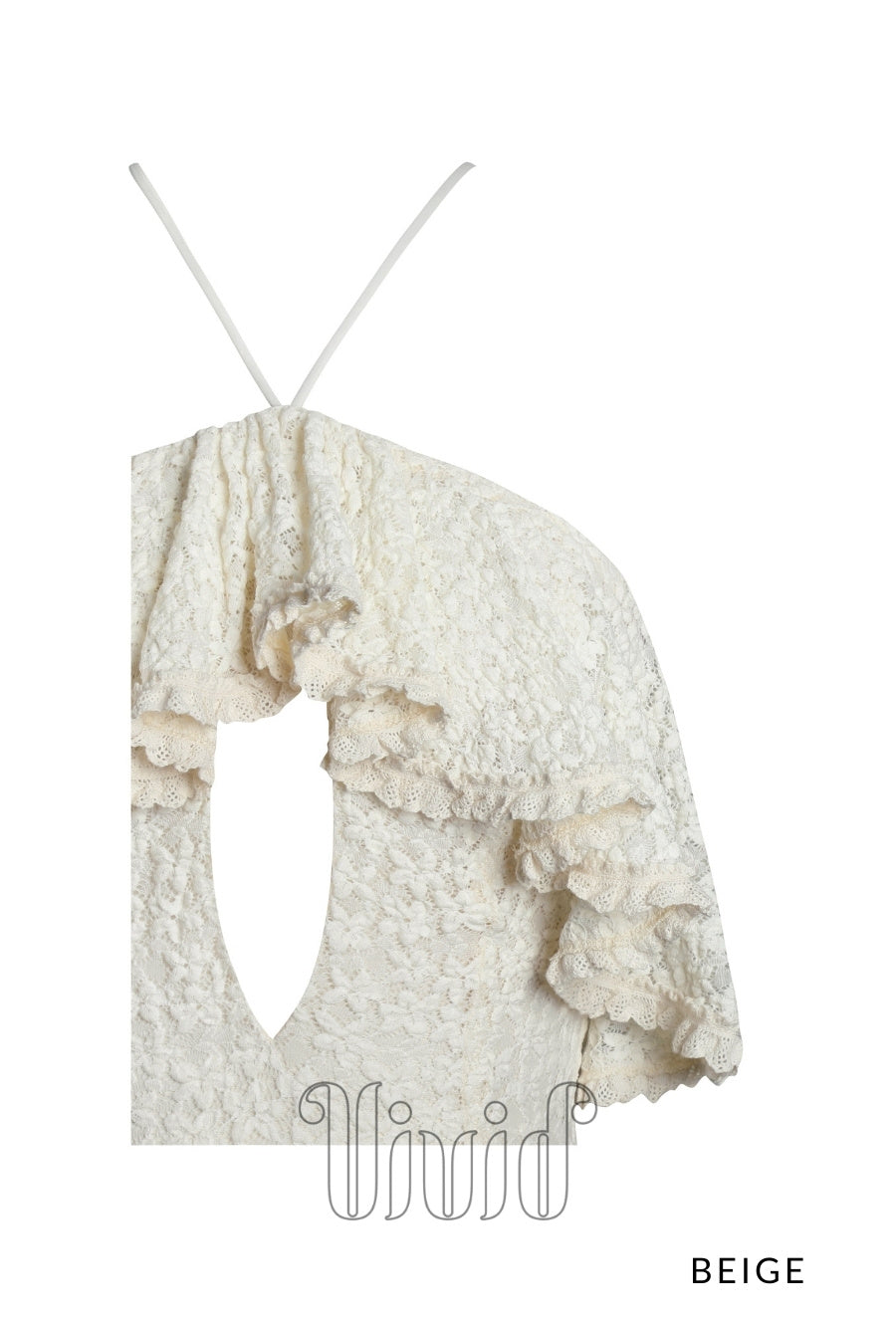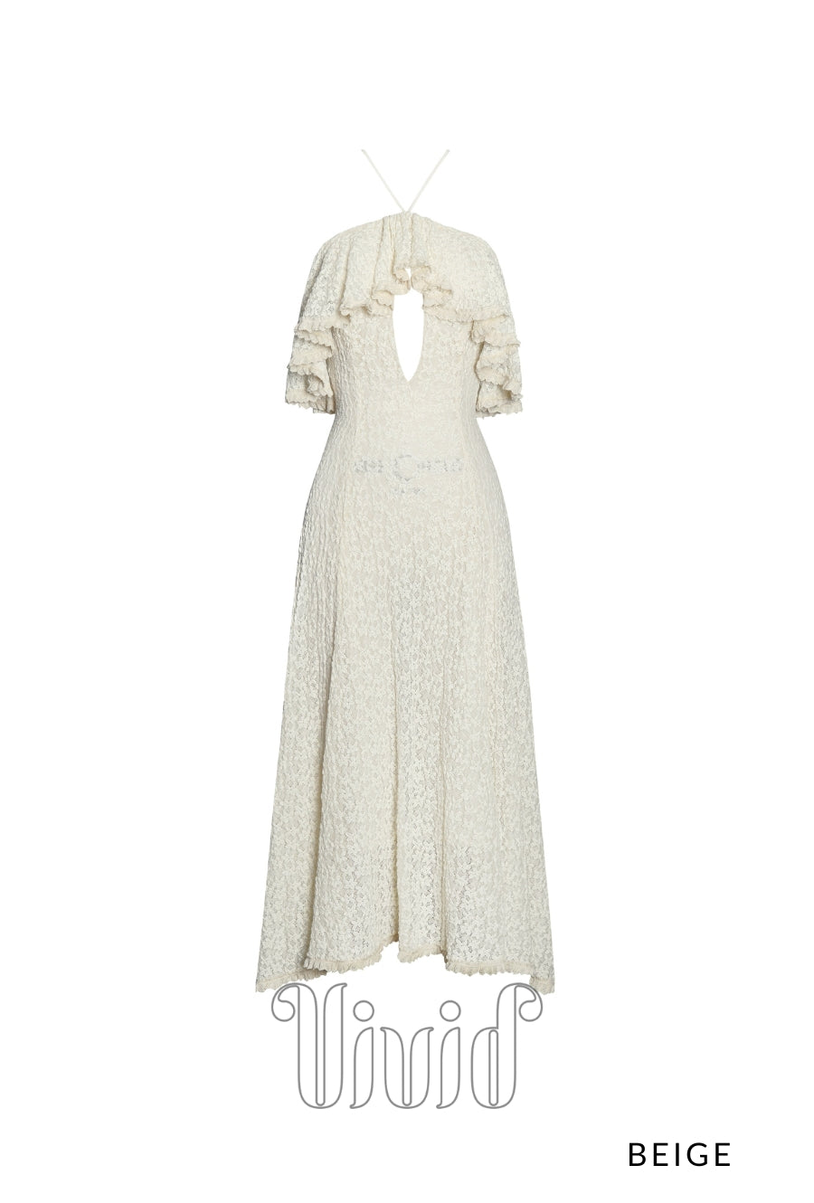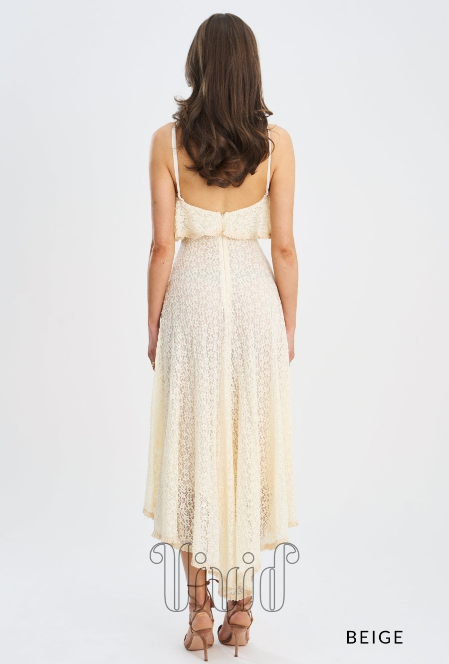 Ethereal and effortlessly romantic, the Florence Dress brings delicate details to life in a graceful midi high/low silhouette. Designed in a soft beige floral crochet fabric, this sleeveless dress features a ruffled bust decoration, lace trim, and a subtle keyhole cutout for a touch of charm. The adjustable straps and stretchable fit ensure comfort, while the trailing hem adds movement and elegance. Finished with an invisible zipper and an alluring backless design, the Florence is perfect for warm-weather soirées, vacation evenings, or any moment you want to feel beautifully undone.