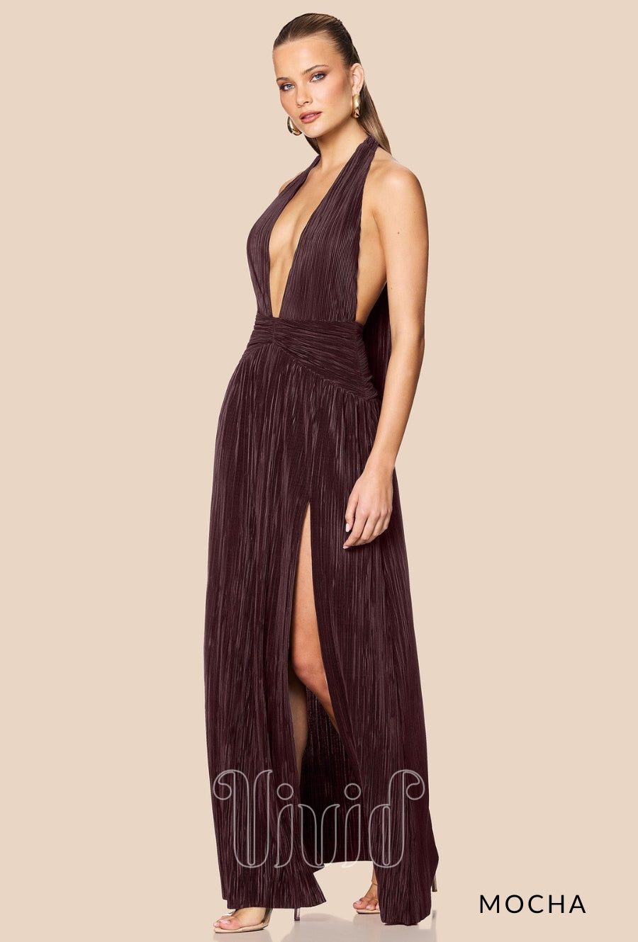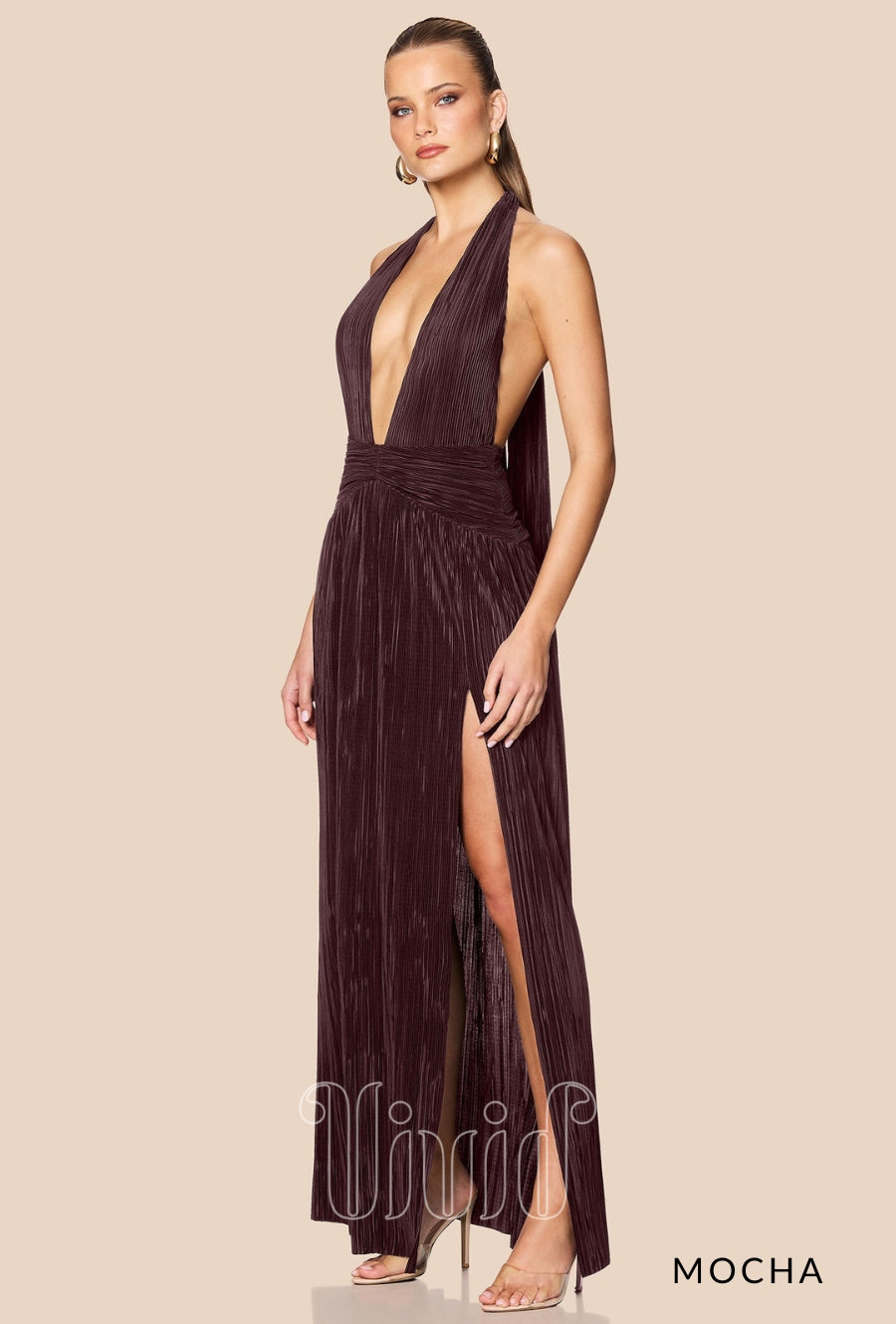 This incredible halter maxi is crafted from a soft pleated jersey and features an ultra low neckline, snatched waist and thigh high front side split. The dress also features an adjustable halter tie, invisible zip at back waist and a lined bodice. PROUDLY DESIGNED AND MADE IN AUSTRALIA.