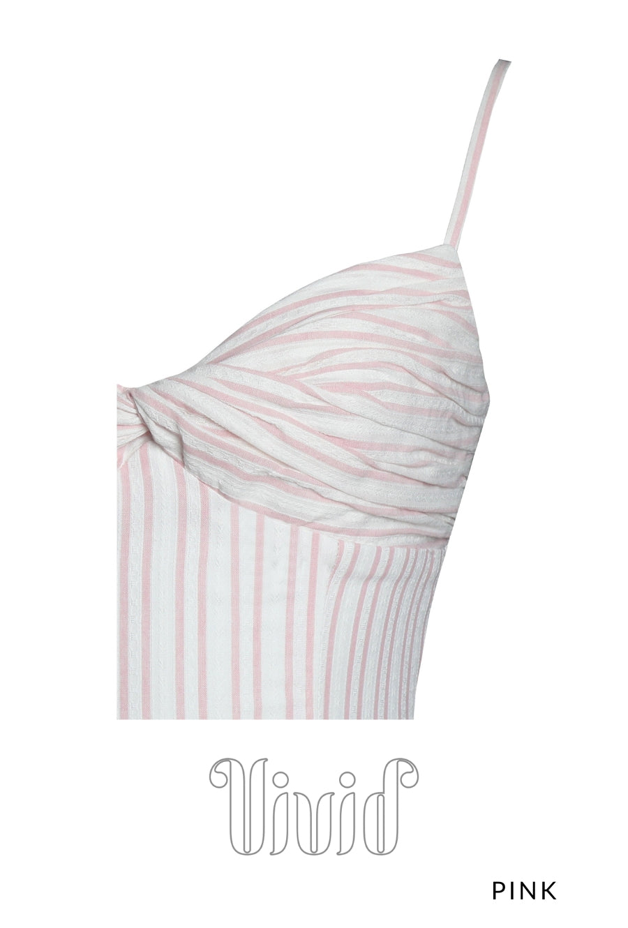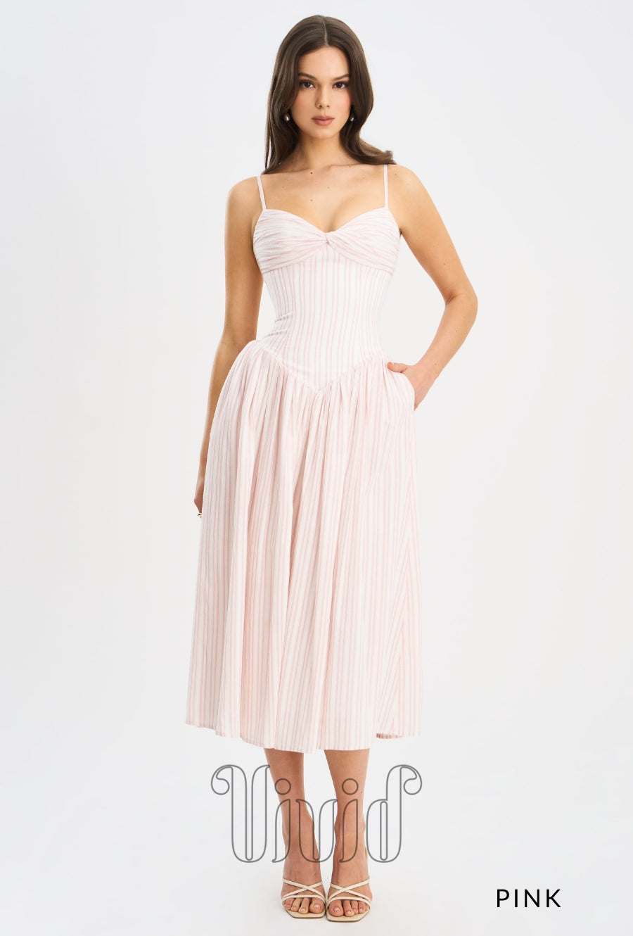 Charming and effortlessly flattering, the Candy Dress features a ruched bodice and a soft pink and white stripe pattern enhanced by delicate woven detailing. The drop waist and V-shaped waistline sculpt the figure beautifully, supported by built-in boning for added structure. Designed with adjustable straps, practical pockets, and an invisible zipper, this midi-length dress is fully lined for comfort and elegance. A timeless piece perfect for warm days, garden parties, or casual chic occasions.