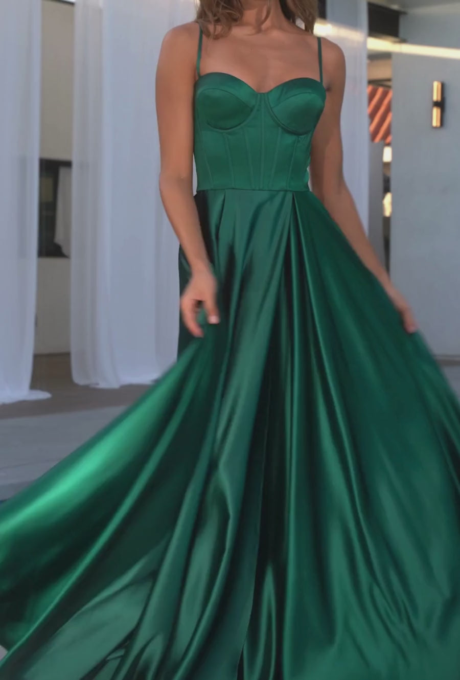 Make a statement in this timeless satin A-line bustier dress. With a classic and elegant feel, this exquisite dress will never go out of style. Its A-line silhouette cascades in a beautiful flow, and the satin fabrication is divinely soft to the touch. The thin straps offer a delicate femininity, and the boned corset bodice provides a stunning and sophisticated look. Add a hint of allure with the sophisticated leg slit. Perfect for a romantic dinner date or a special night out, this divine dress will surely turn heads. Experience exquisite style with this classic and elegant satin A-line bustier dress.