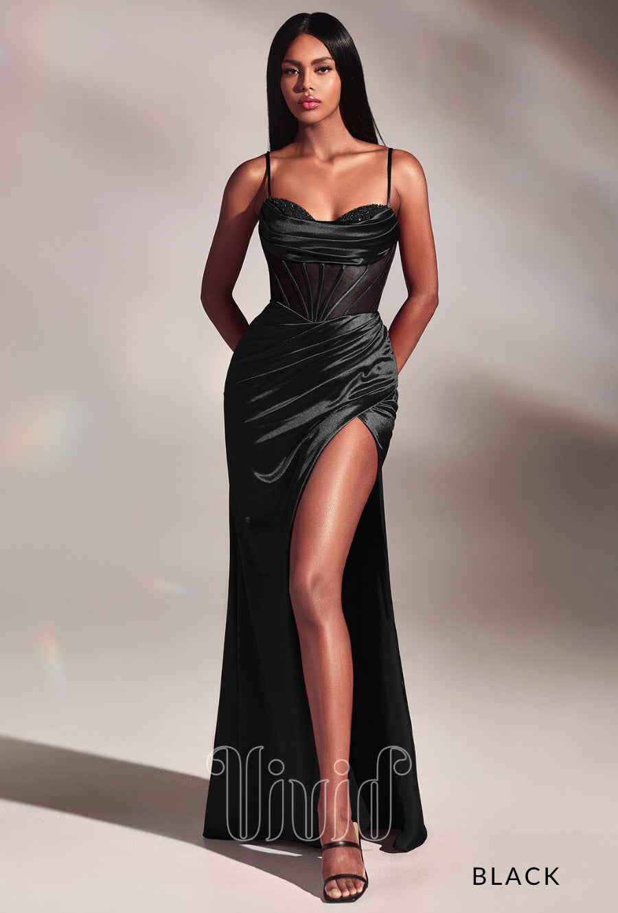 This amazing evening gown is crafted from satin and features a soft cowl neckline, a sheer corset style bodice with exposed boning and embellished bust cups. The gown also features a lace up back and wrap style skirt with thigh high front side split.