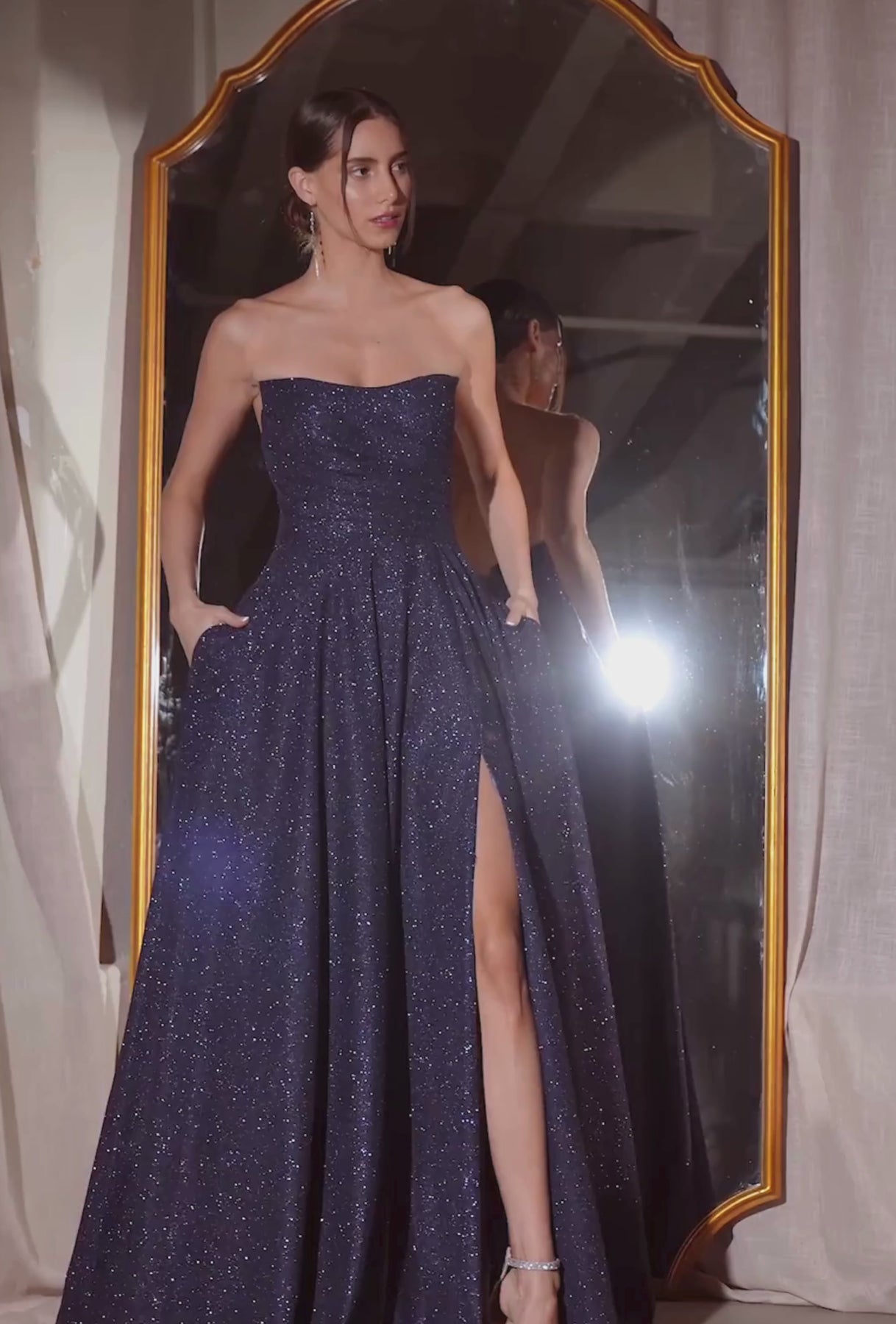 This enchanting A-line gown shimmers with every step, featuring a strapless scoop neckline and a delicately gathered bodice for an effortlessly elegant look. The pleated skirt flows beautifully, enhanced by a leg slit for a hint of drama, while the lace-up corset back ensures a perfectly sculpted fit. Crafted from glitter-dusted fabric, this gown is a radiant choice for prom or any formal occasion.