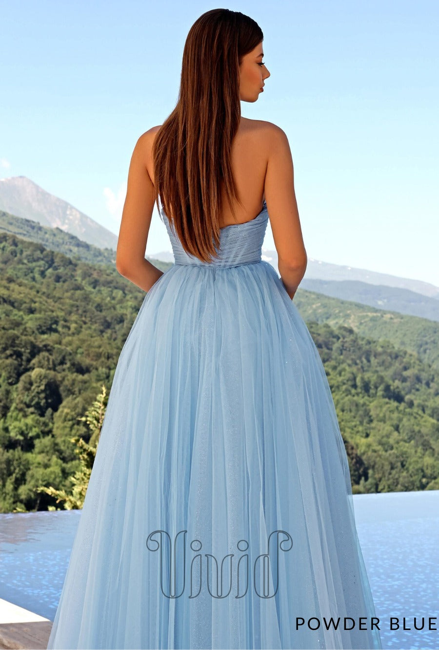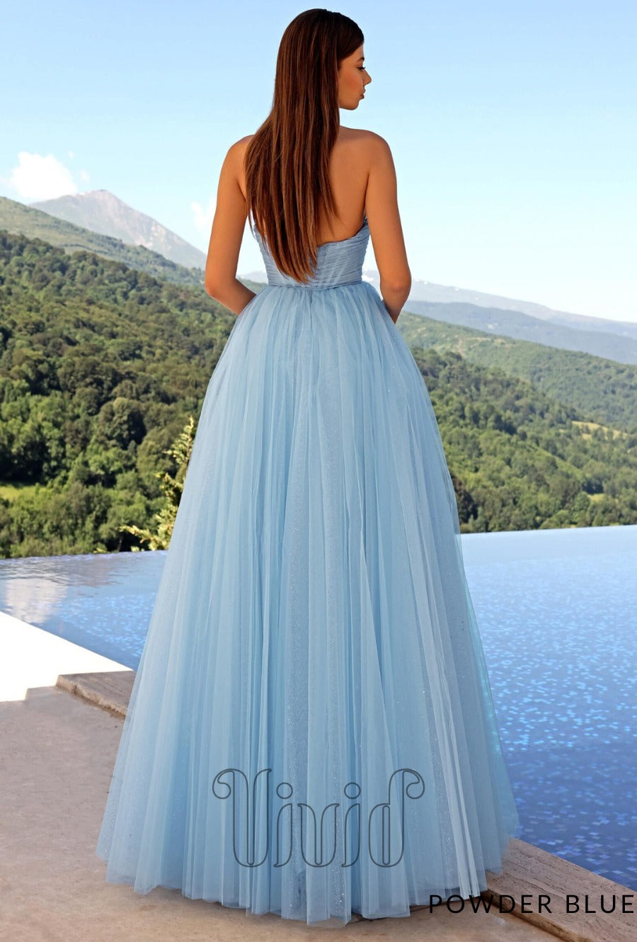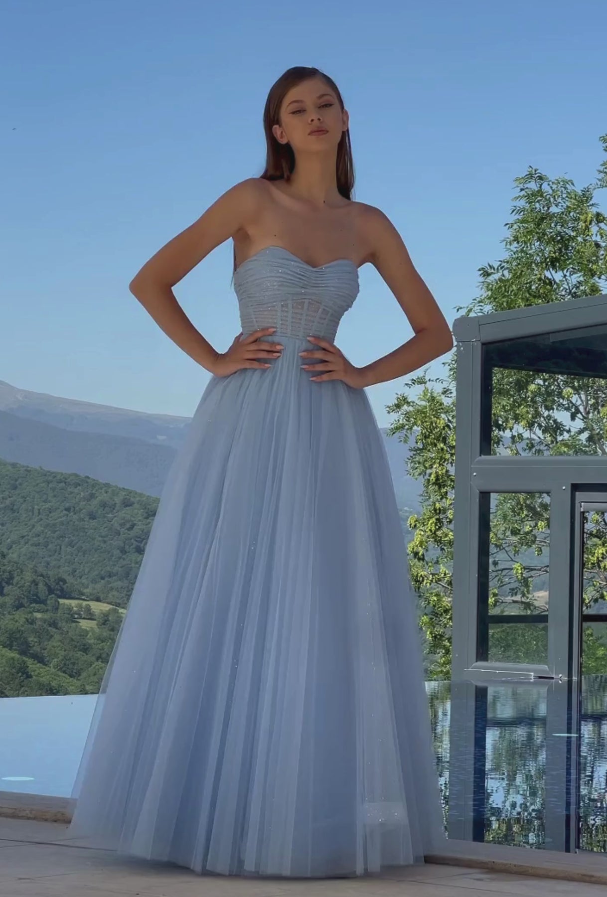 Get ready to be the belle of the ball in this splendid tulle ball gown, a perfect choice for formal occasions. The gown features a semi sheer bodice for a hint of sexiness and exposed boning and gather detailing for a dash of allure. The strapless sheer boned bodice ensures that the dress clings to your body in all the right places. Elevating the style, a fabulous layered tulle skirt with iridescent glitter gives the gown an eye-catching flow. Make sure enter any special event in the highest level of glamour and elegance.