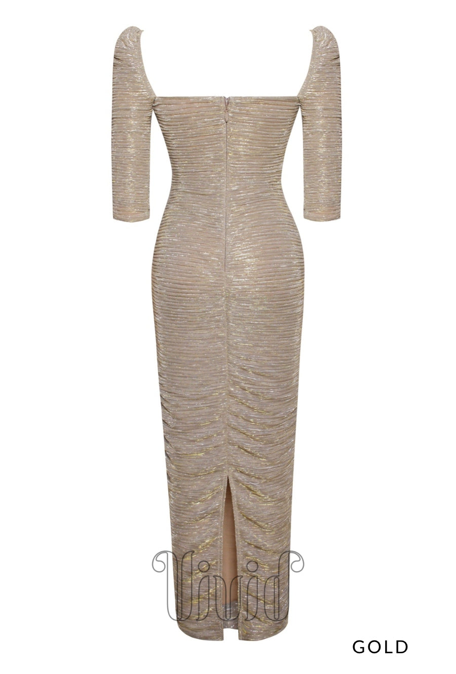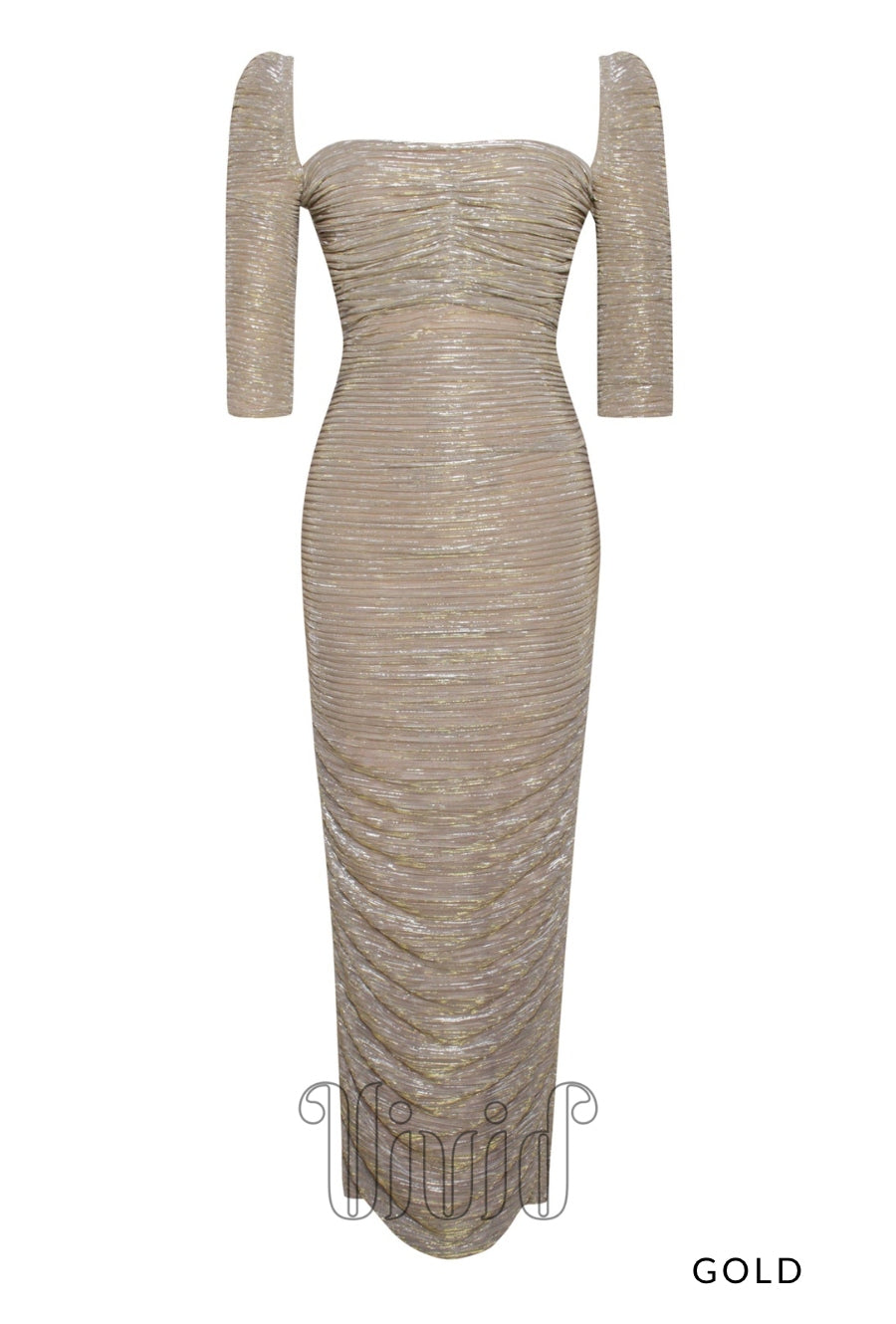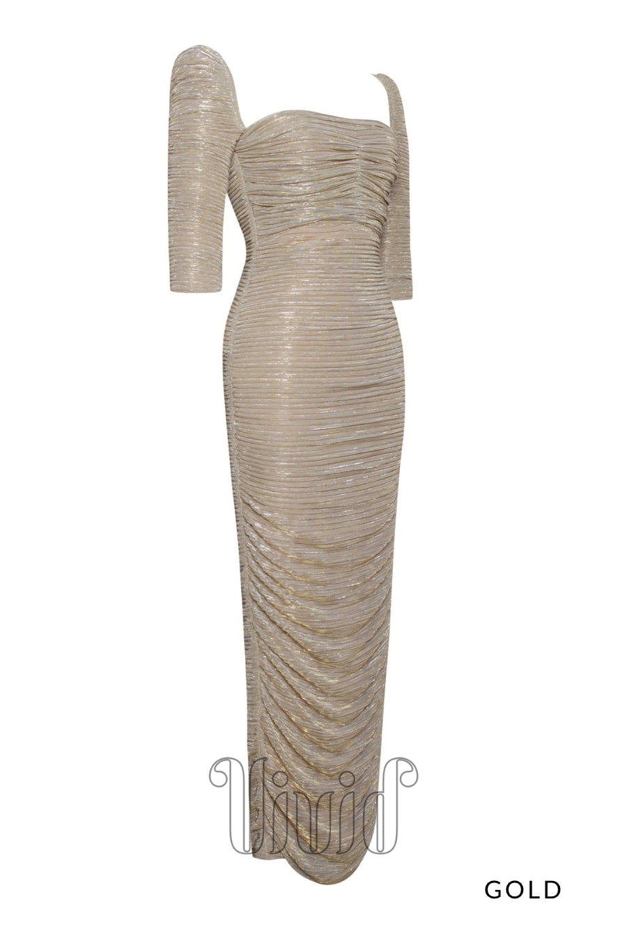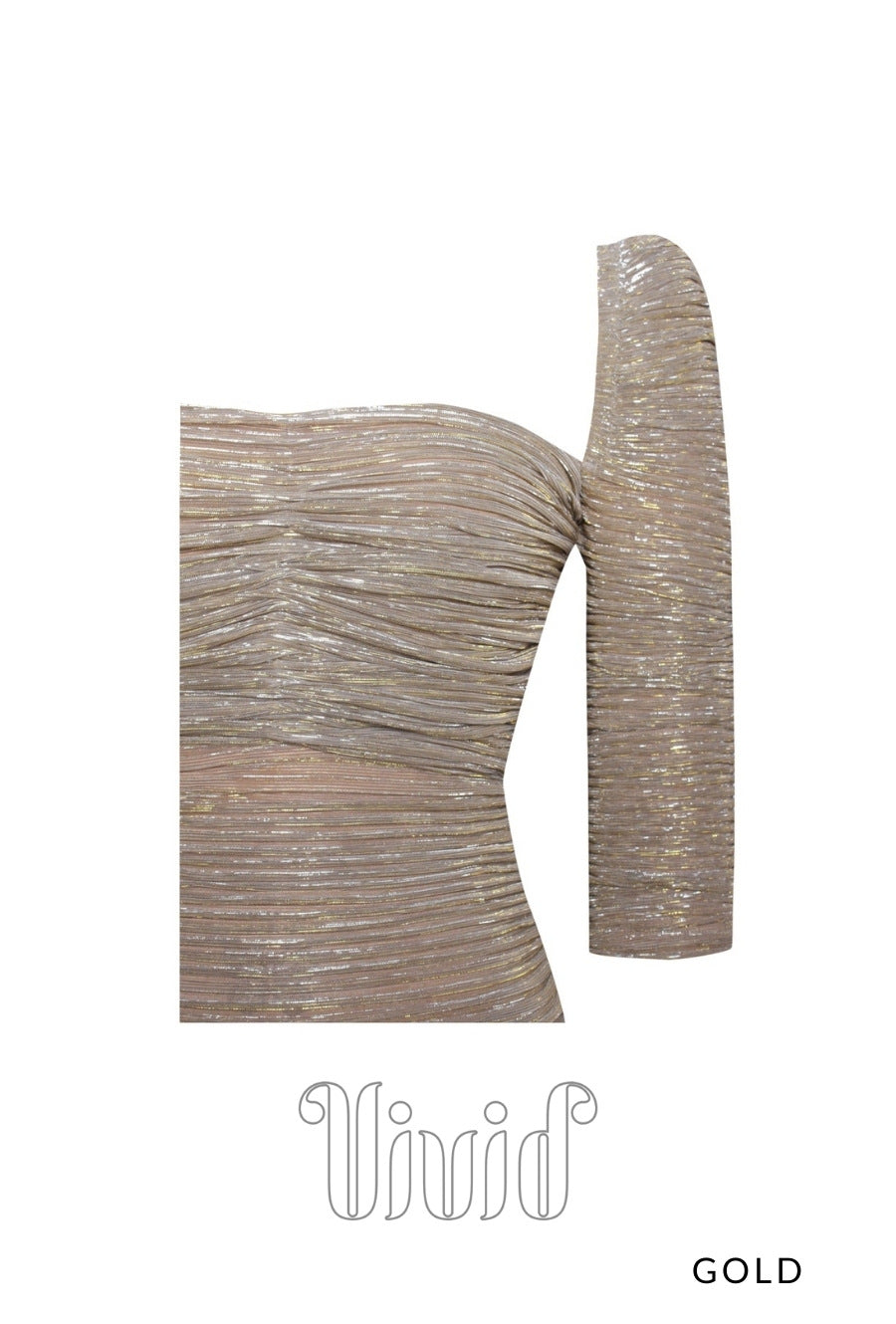 This glamorous dress is an update on our classic Clara Dress and is cut from the same lux stretch chiffon. The dress is crafted from metallic pleated chiffon and is fully lined with stretch crepe creating a nude illusion. The dress is lightly padded for lift and support and is ruched to hug and enhance your natural curves. The dress features long sleeves and flattering ruching throughout.