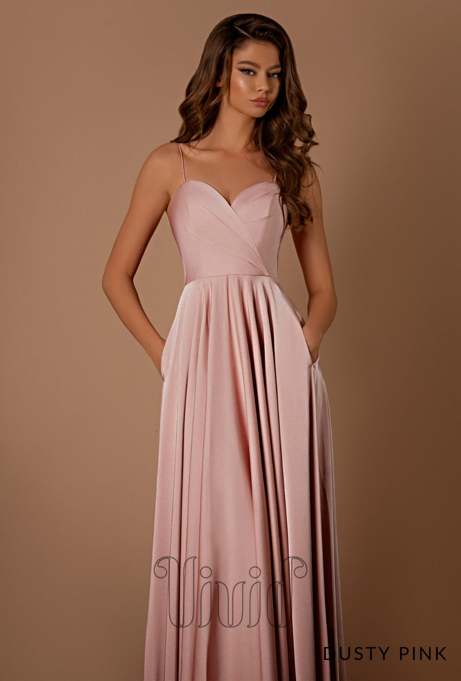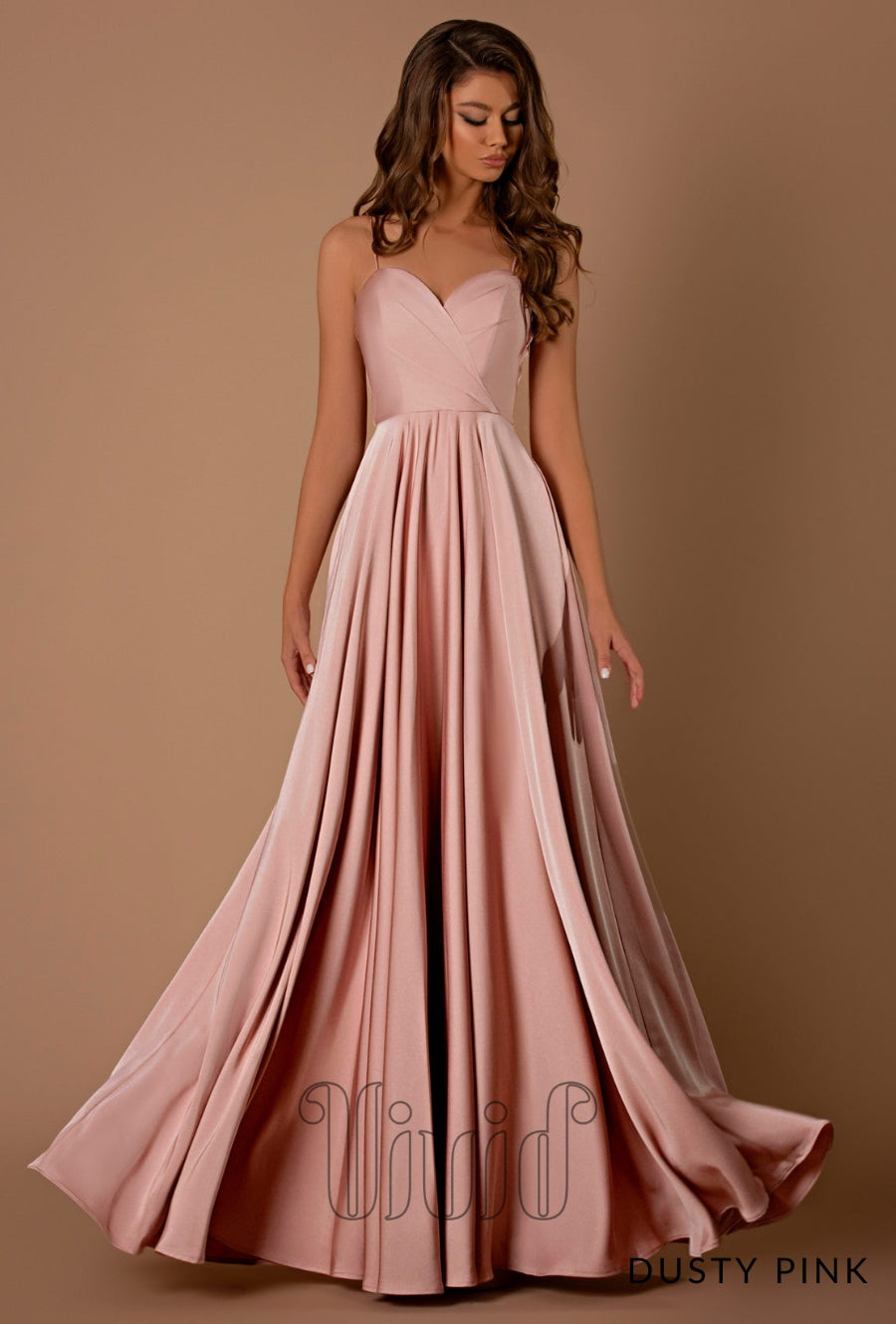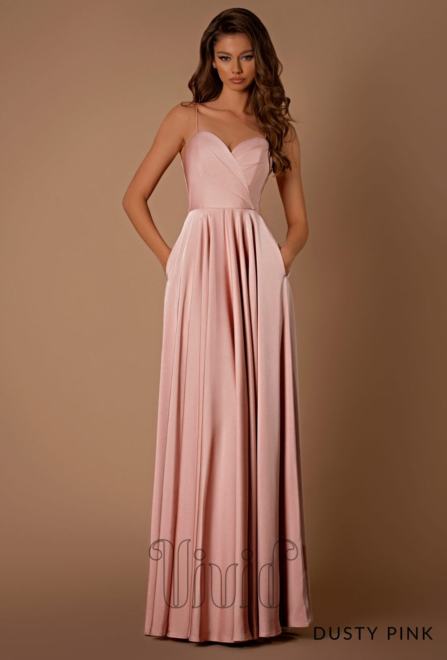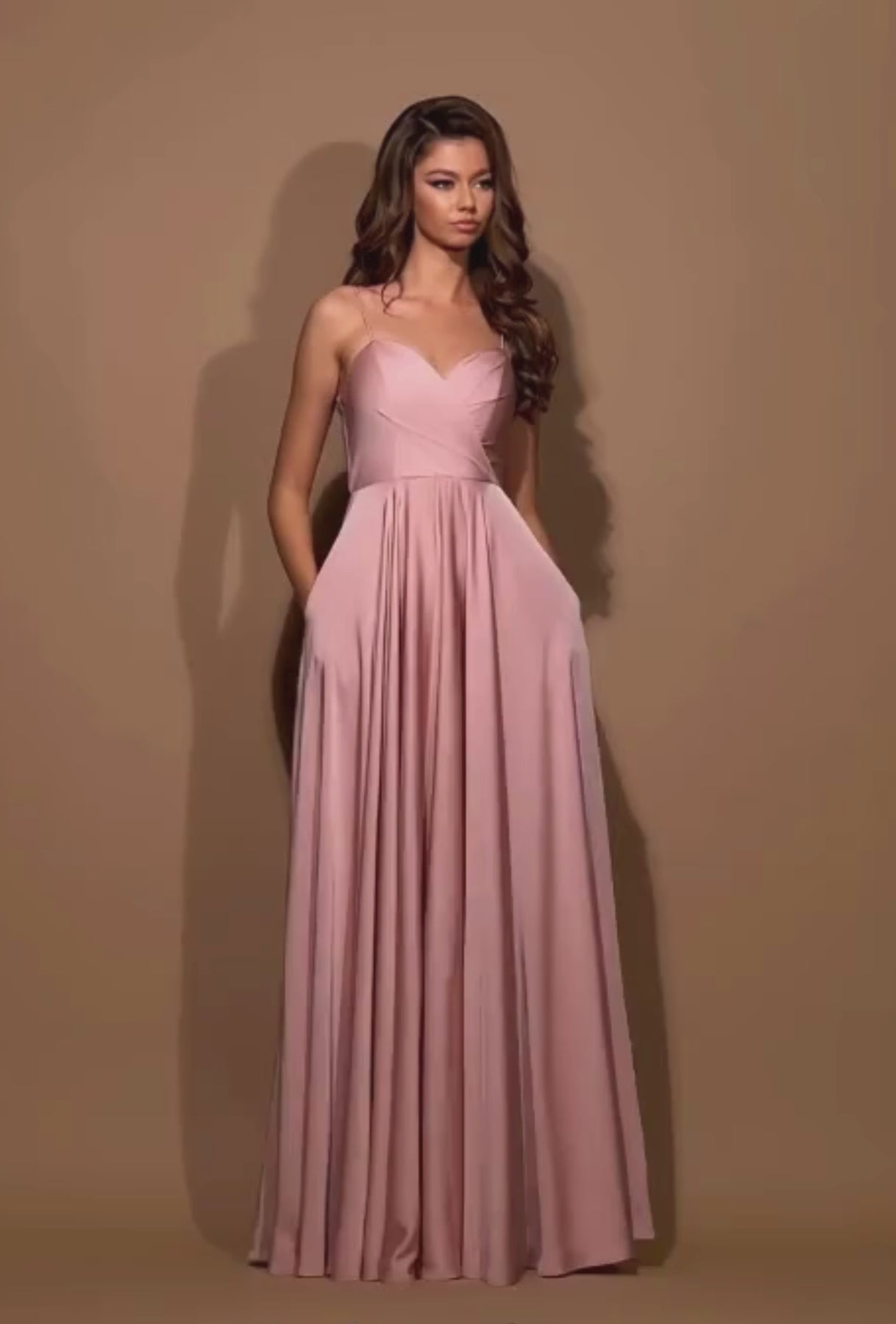 This stunning full length evening gown features a sweetheart neckline with crossover front, fully boned bodice and elegant rouleaux straps. The dress also features a full skirt with built in side pockets.