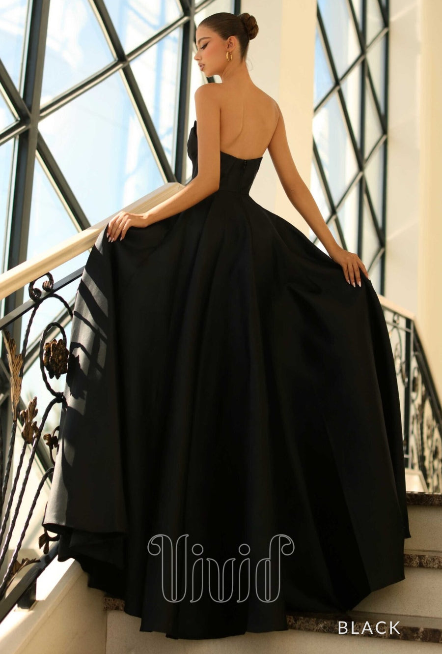 An unforgettable gown destined for a special occasion in your life! This stunning gown features a strapless boned bodice with an angled neckline with gather detailing across the bodice and a full skirt with front thigh high side split.