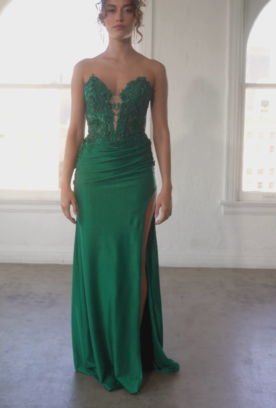 This stunning strapless fitted dress will have you looking like a total prom queen! The fitted silhouette flatters your figure and the lace appliqued bodice gives the dress even more stylish flair. The sheer boned bodice is comfortable and supportive while still showing off just enough skin, and the iridescent shine satin catches the light for an eye-catching, luxurious look. A leg slit adds just enough sexiness to make this look perfect for the most glamorous of occasions. Whether you're attending a red carpet event or sashaying to a prom dance, this dress will capture all eyes as soon as you walk in the room!