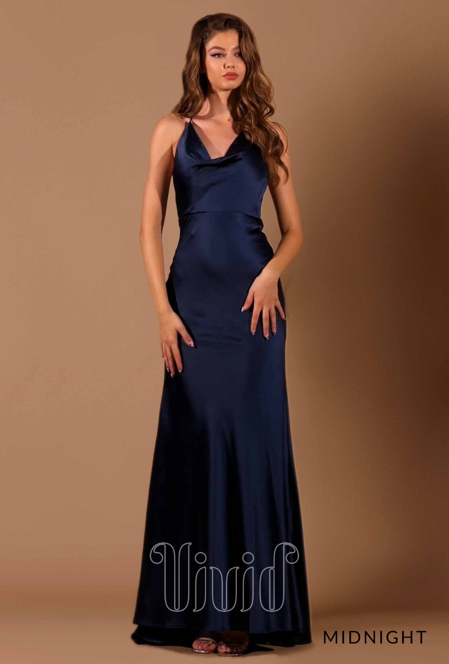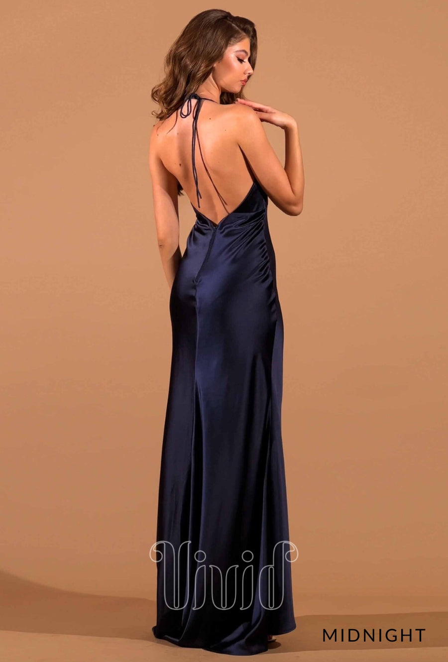 This stunning halter neck evening gown is crafted out of a stretch satin and features a boned bodice with cowl neckline and a column skirt with a slight mermaid hem.