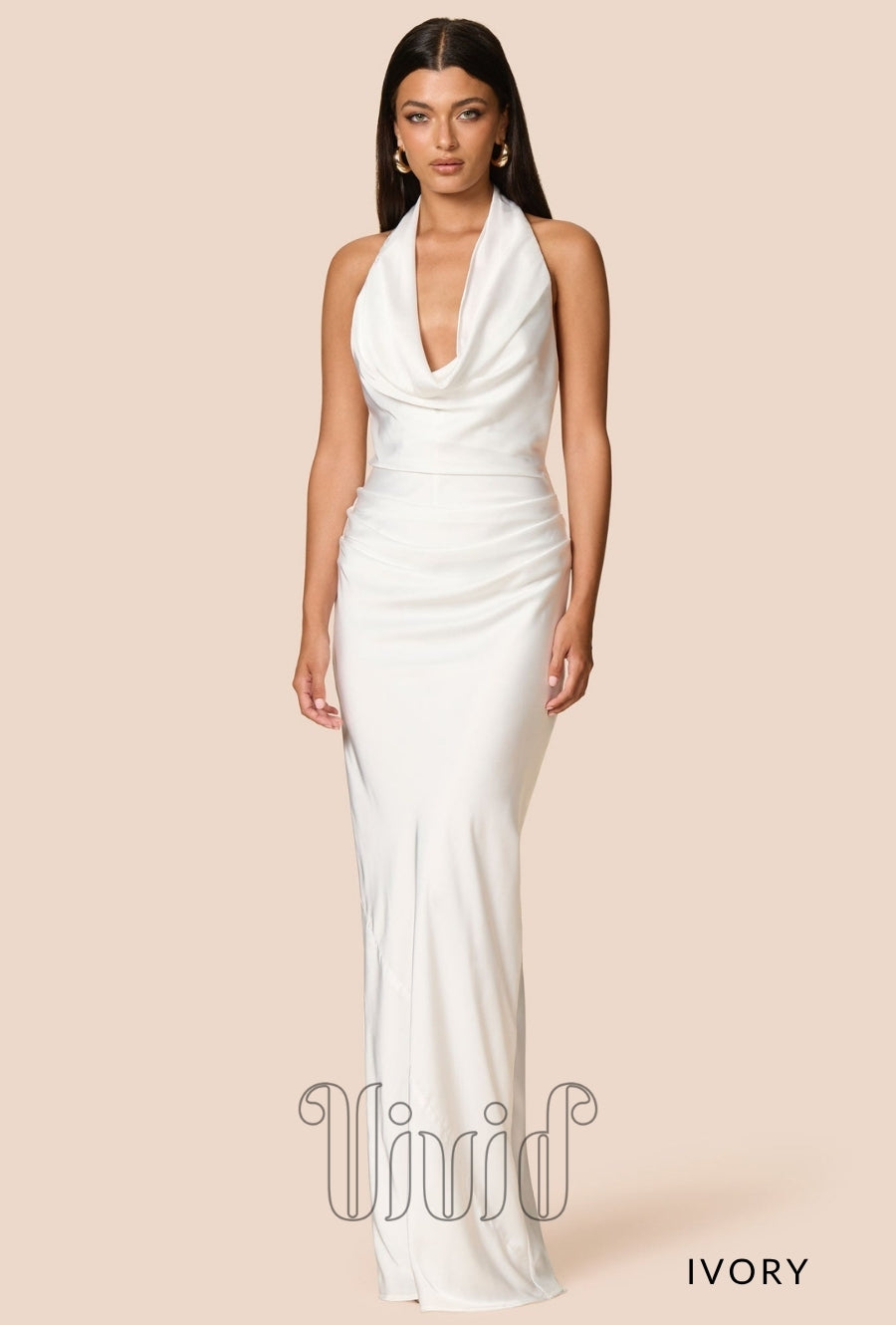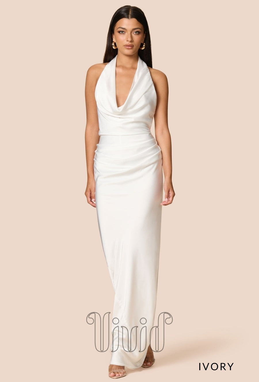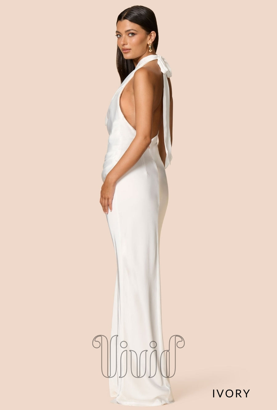 This effortless satin halter gown is crafted from a luxurious lightweight satin and features a low plunging neckline and deep tucks at the side waist. This elegant gown also features a long tie at back neck, invisible zip at back waist and is fully lined. PROUDLY DESIGNED AND MADE IN AUSTRALIA.