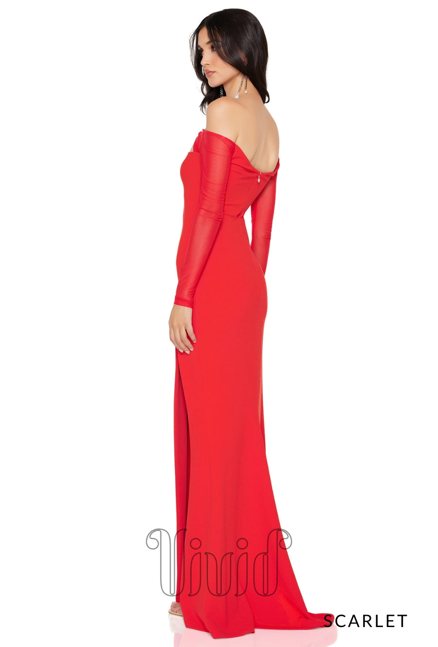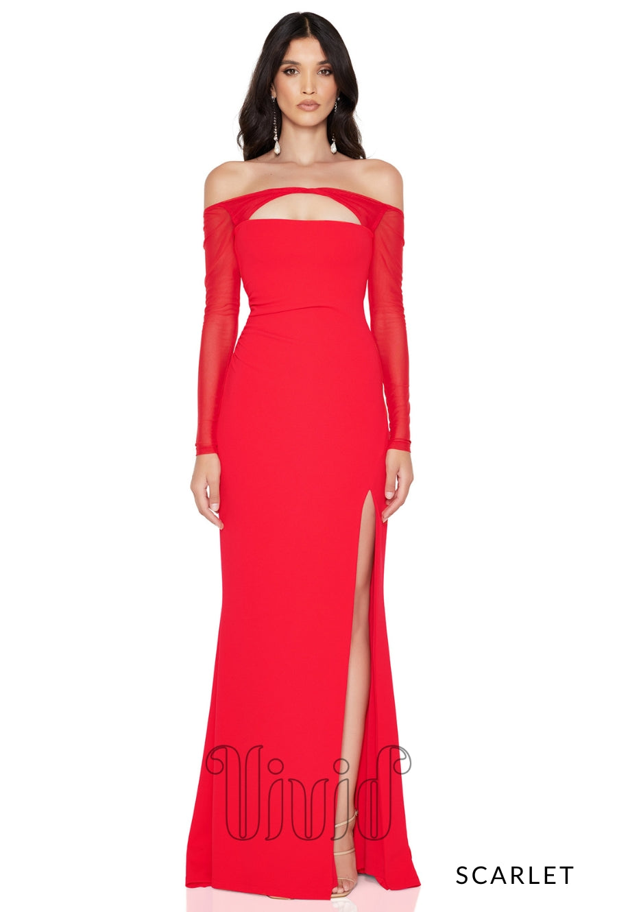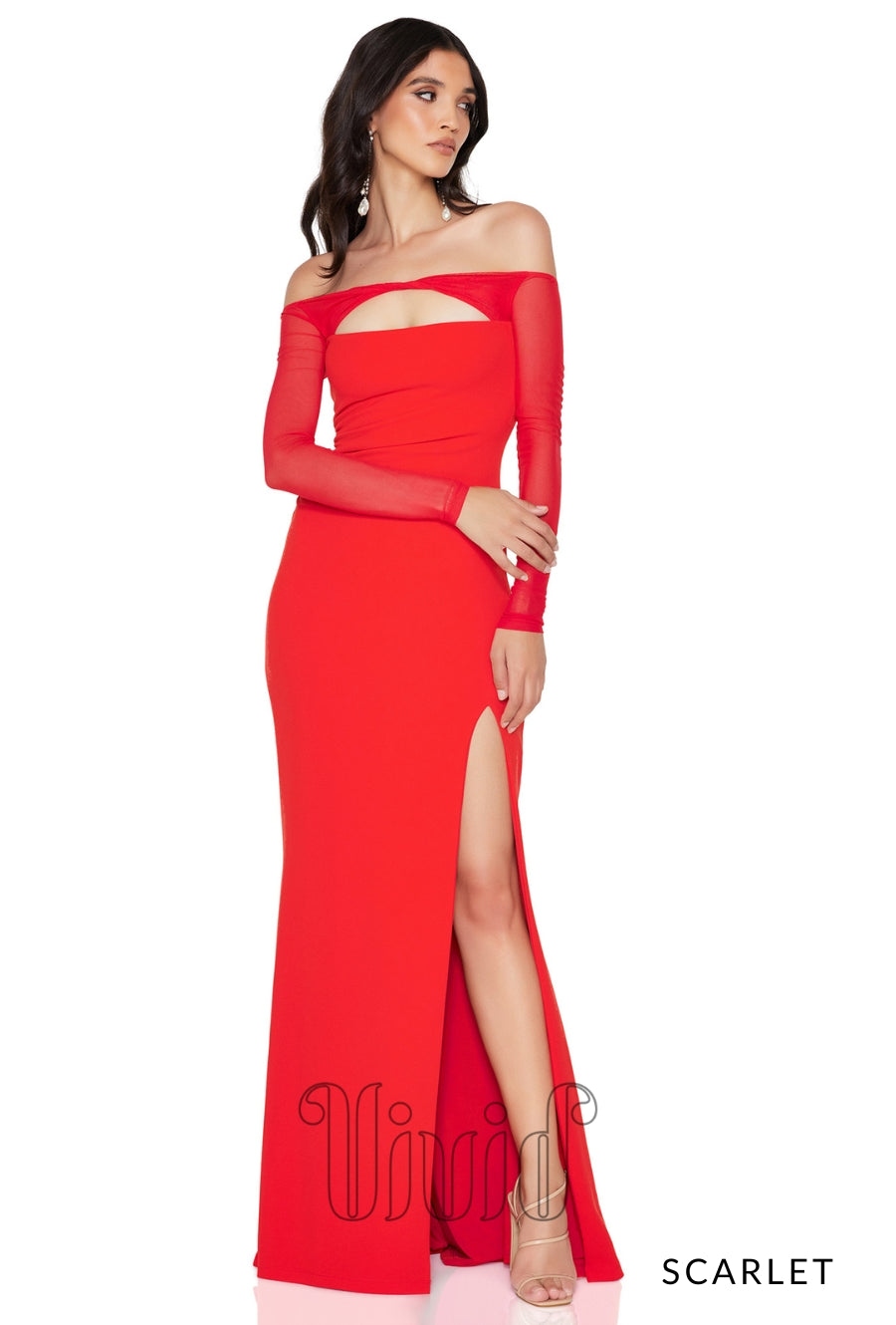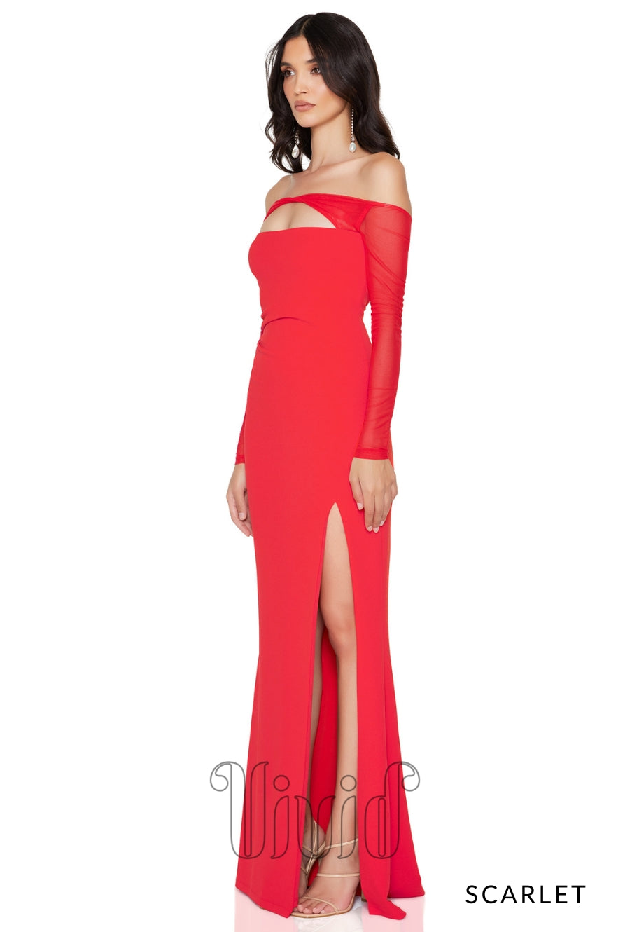 This lavish floor length design is crafted from a form fitting scuba crepe and features a sheer mesh long sleeve and neckline, subtle cut-out detail at the bust and a high front side split and is fully lined.