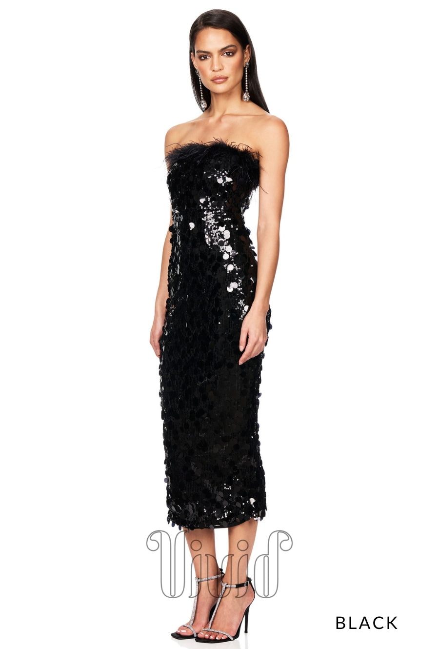 Light up the night with high shining textured sequin and decadent feather details. This must-have midi features a body-hugging silhouette, strapless fit & invisible zip closure at the centre back and is fully lined.