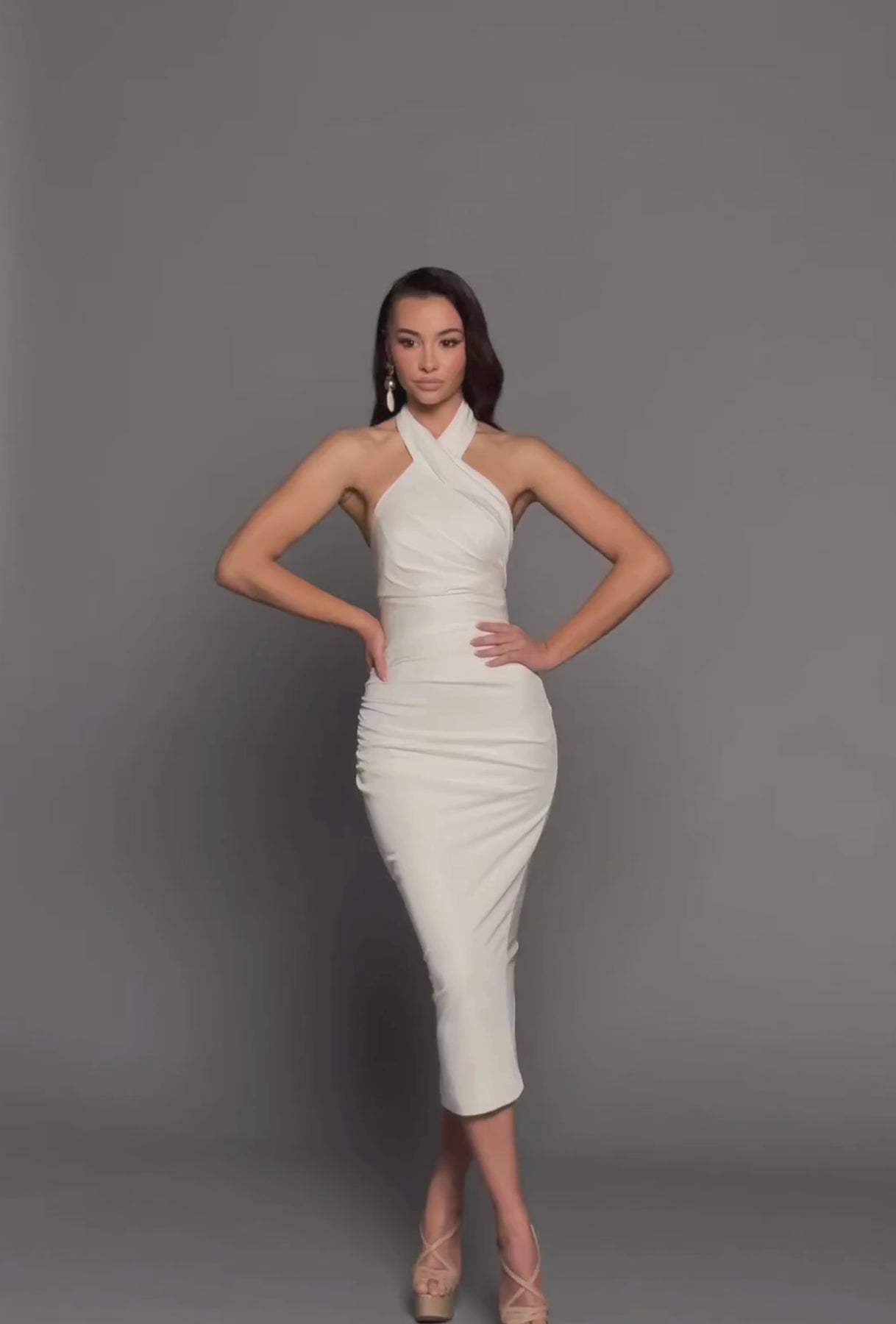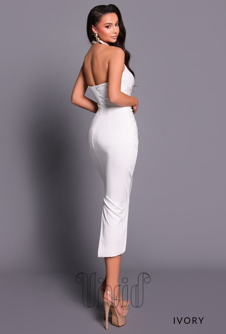 This sleek and sophisticated fitted halter neck midi dress is the perfect blend of understated elegance and modern style. The timeless halter neckline enhances the shoulders and neckline, while subtle gathering on the bodice and skirt creates a flattering, tailored fit that beautifully highlights your shape. The streamlined silhouette offers a sleek, polished look, making it ideal for both formal events and more intimate occasions. This dress radiates effortless charm and refined simplicity, ensuring you make a stunning impression wherever you go.